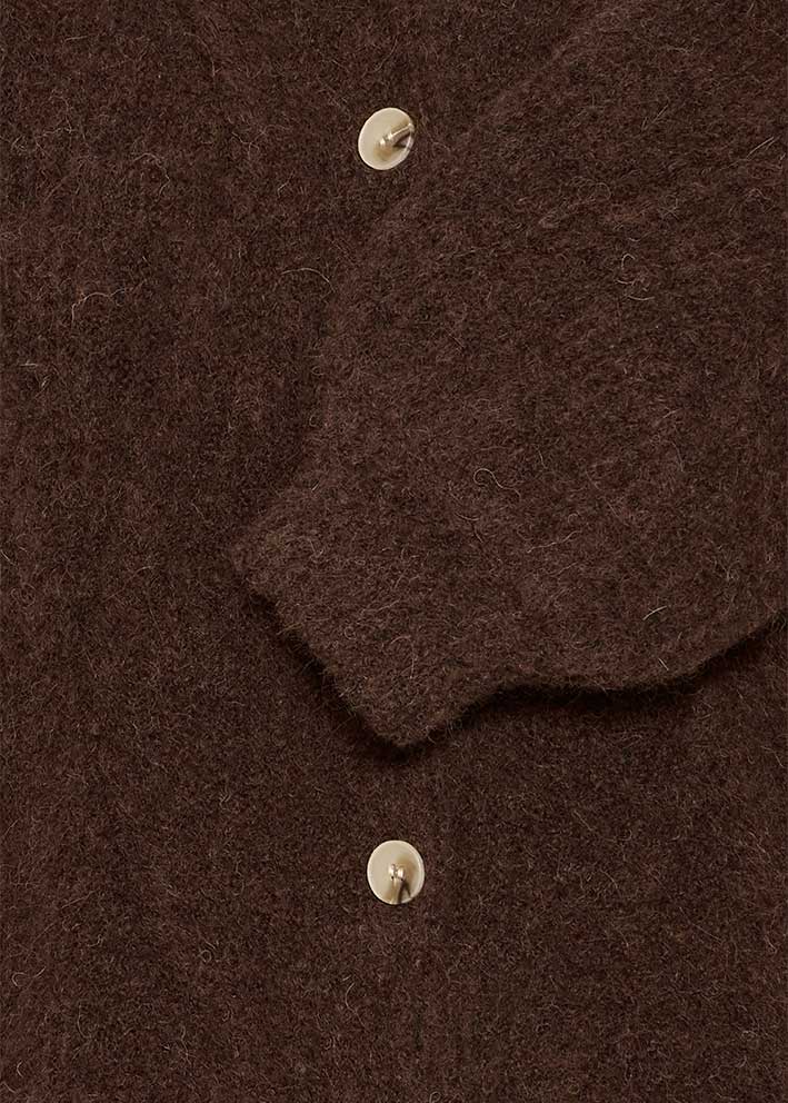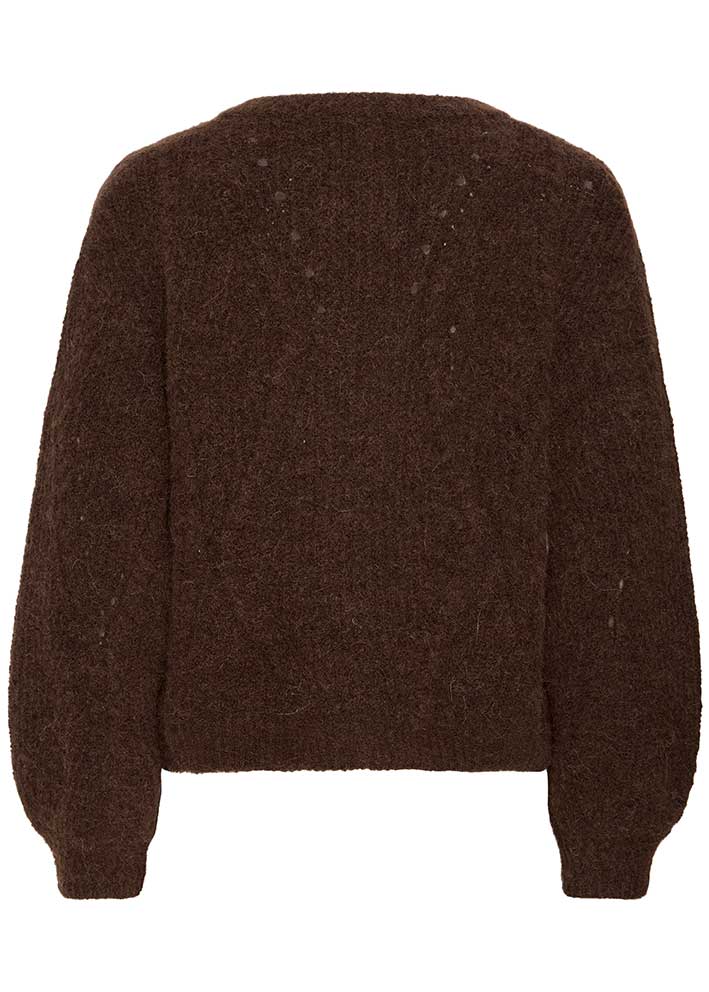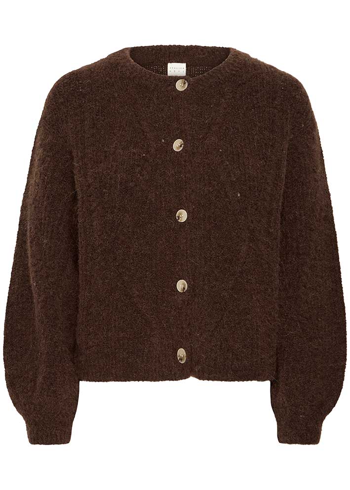 Lækker chokoladebrun Azora cardigan fra Atelier Rêve, strikket i en blød og lun alpaka-kvalitet. Cardiganen har et klassisk løst snit med rund hals, let puffede ærmer med ribkant og knapper ned foran.