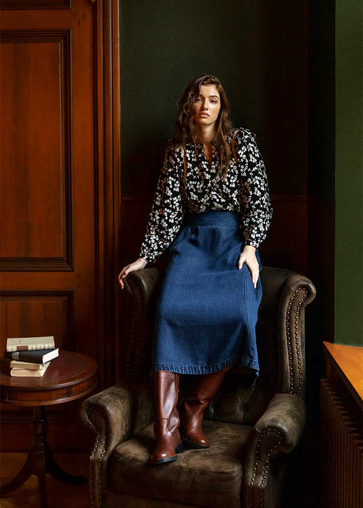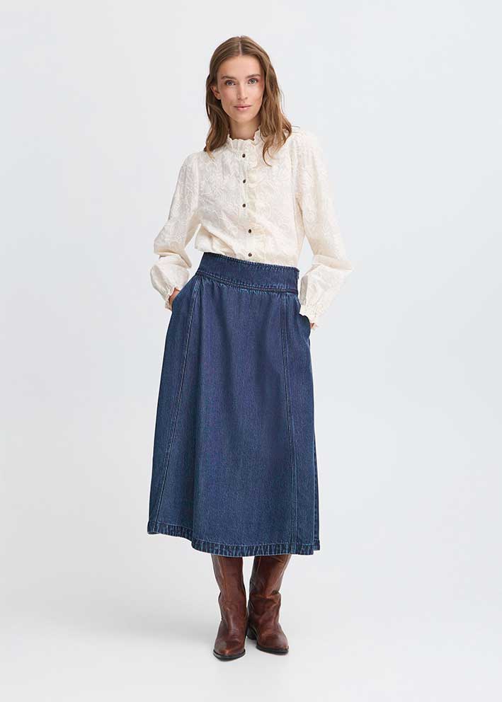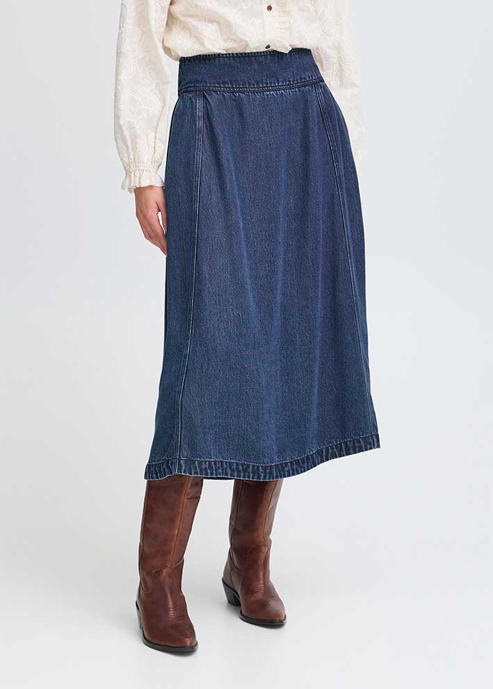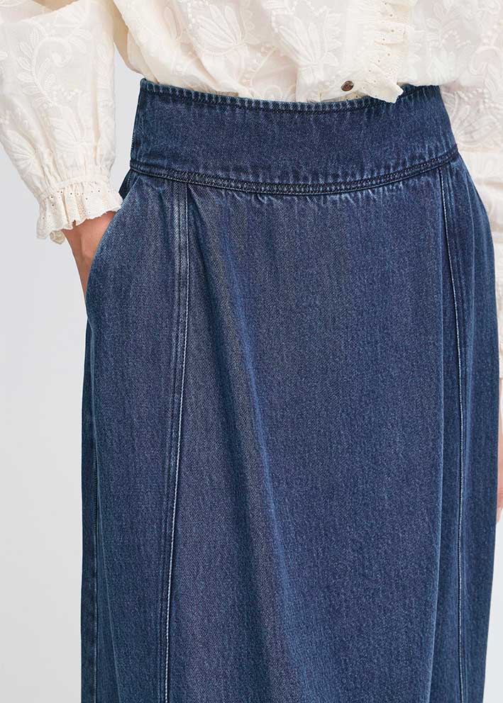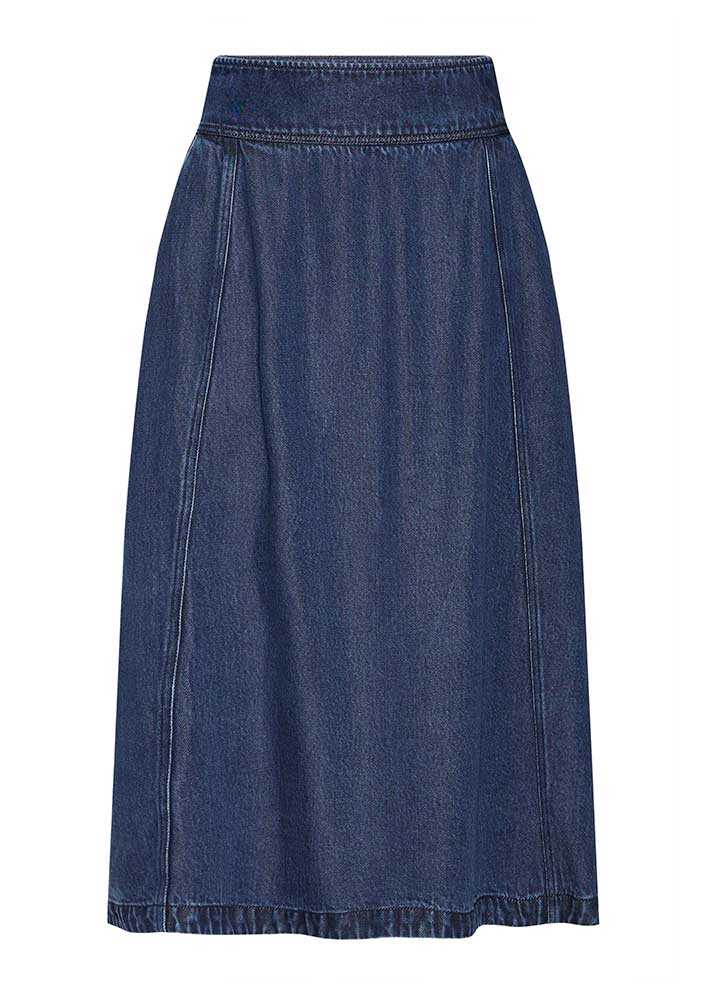 Nederdelen er er fremstillet i en lækker lyocell-kvalitet med et let slidt denimlook og er perfekt og alsidig/nem at kombinere med alt fra skjorter til strik.