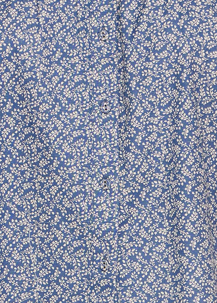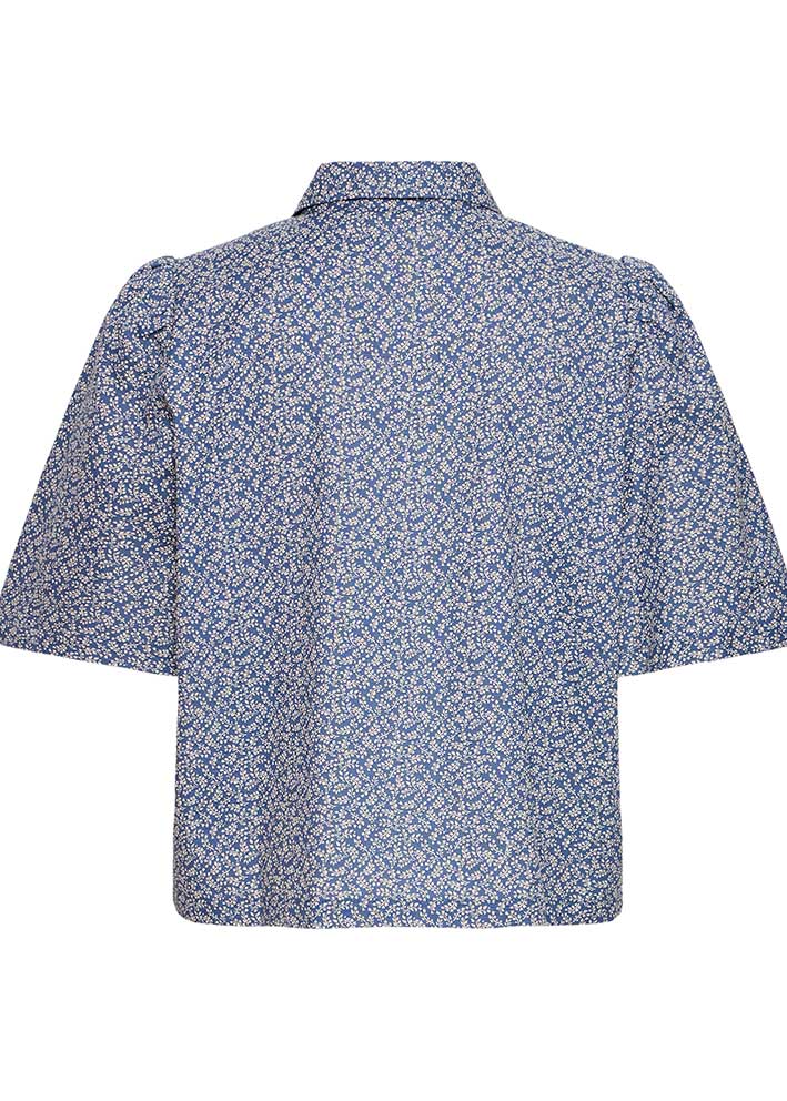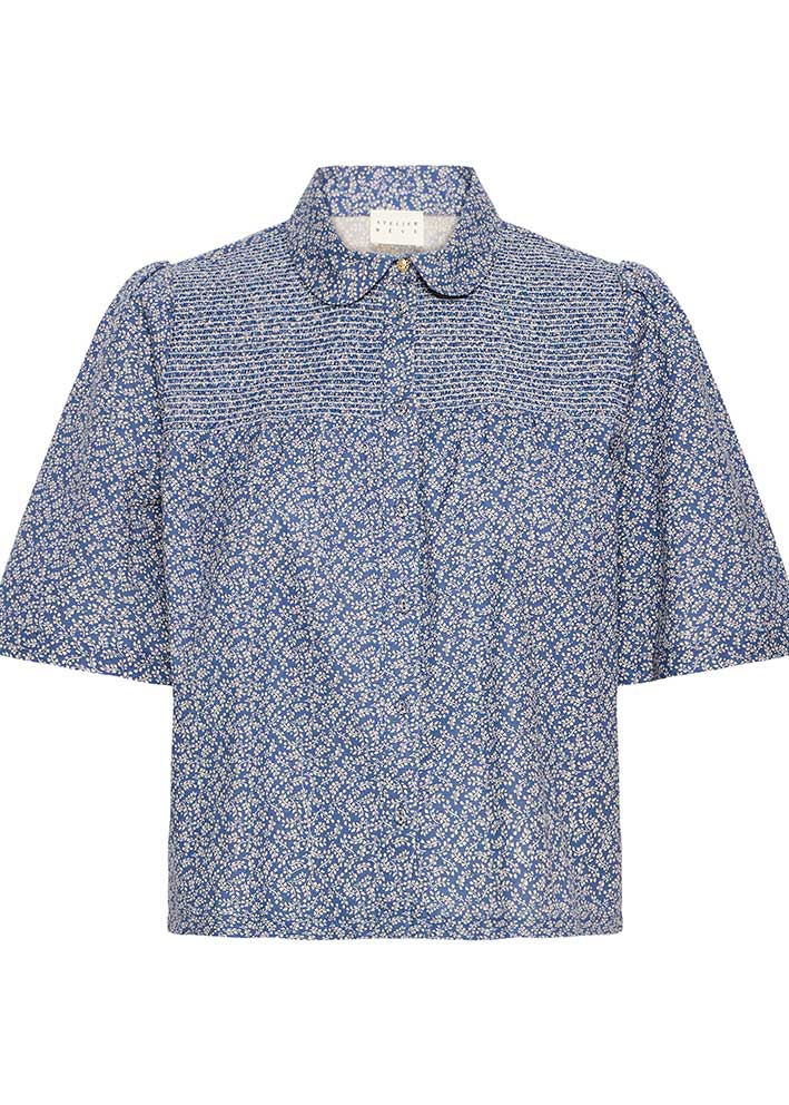 Smuk småprintet blå Odessa skjorte fra Atelier Rêve, designet i et enkelt snit med feminine detaljer: afrundet krave, korte let puffede ærmer og et fint smockstykke foroven, der gør at skjorten sidder supergodt.