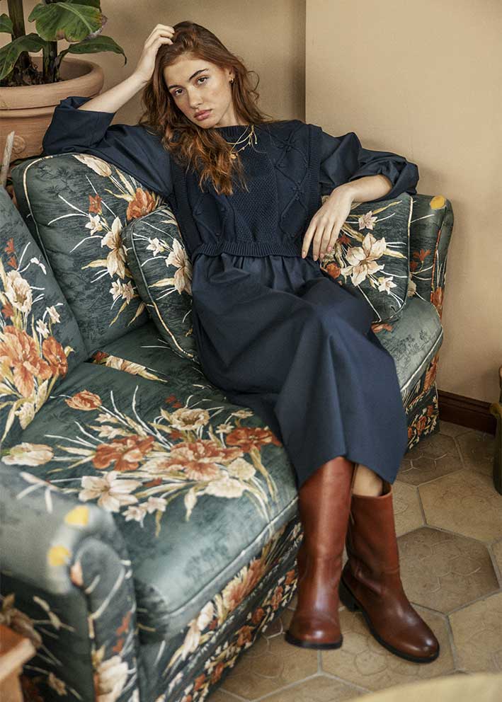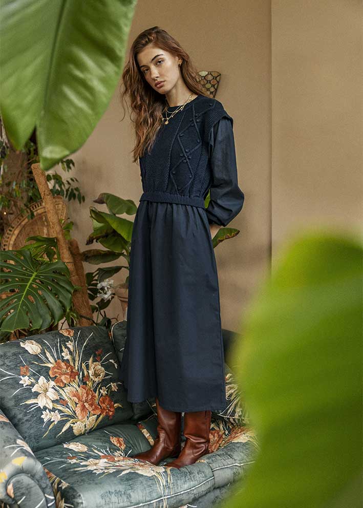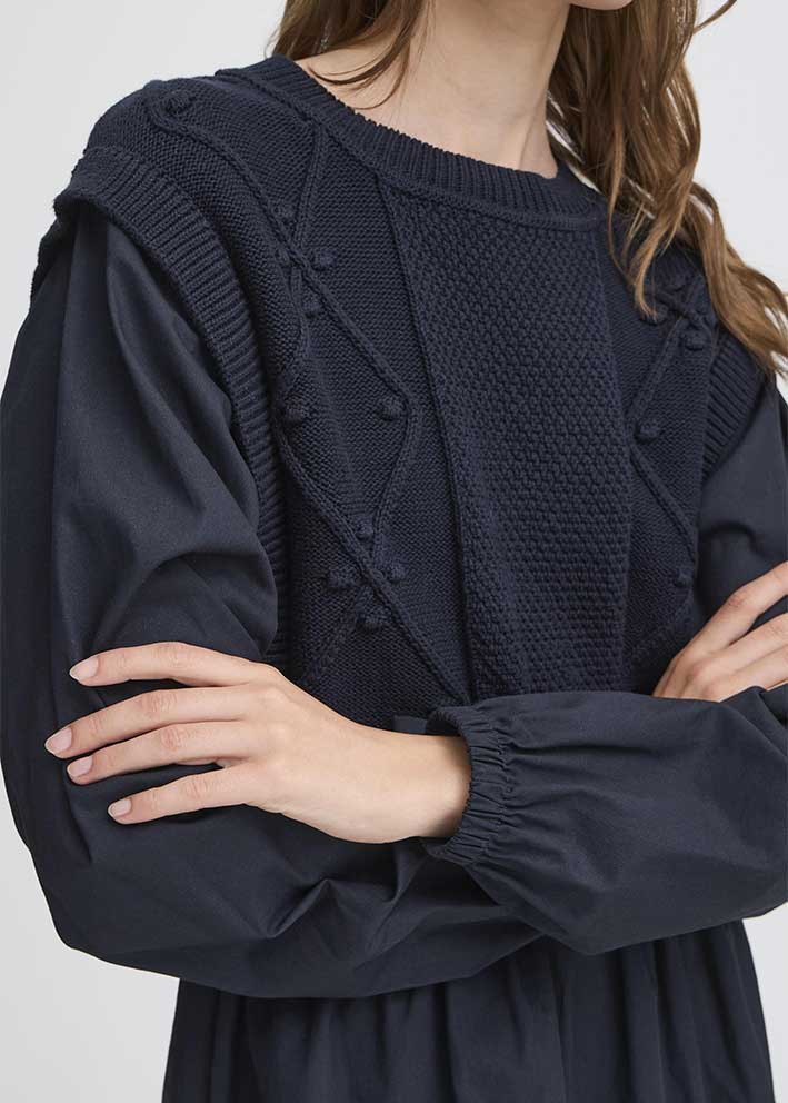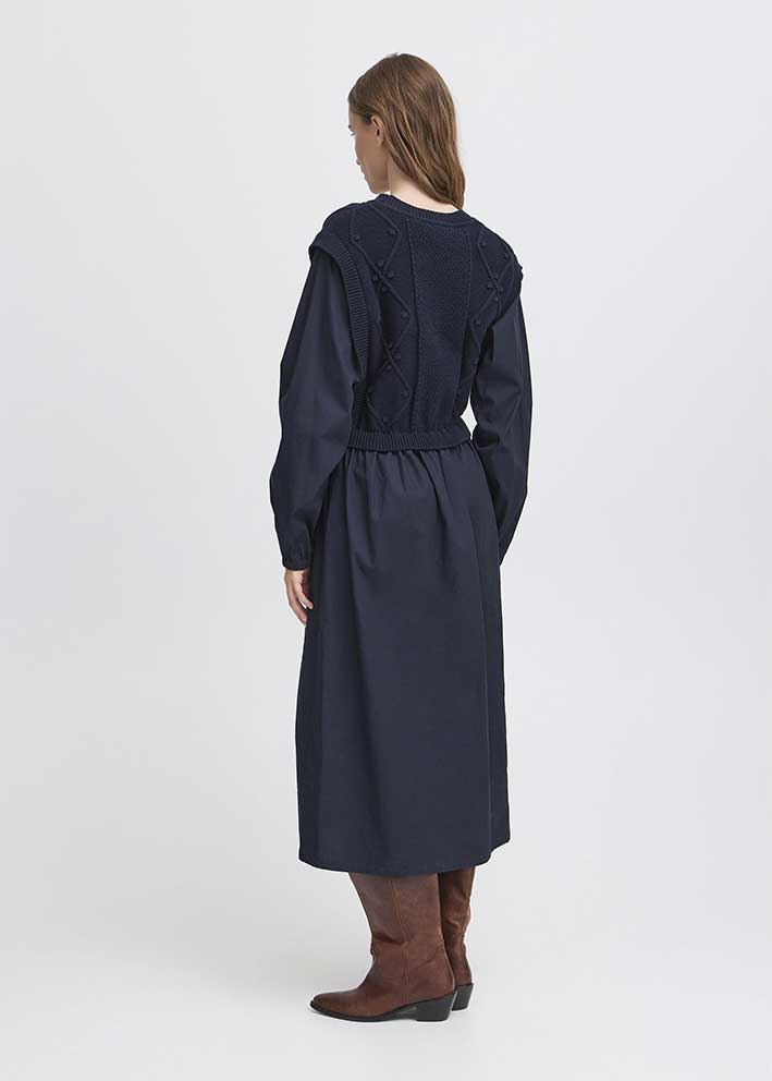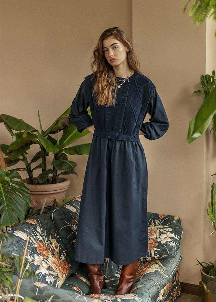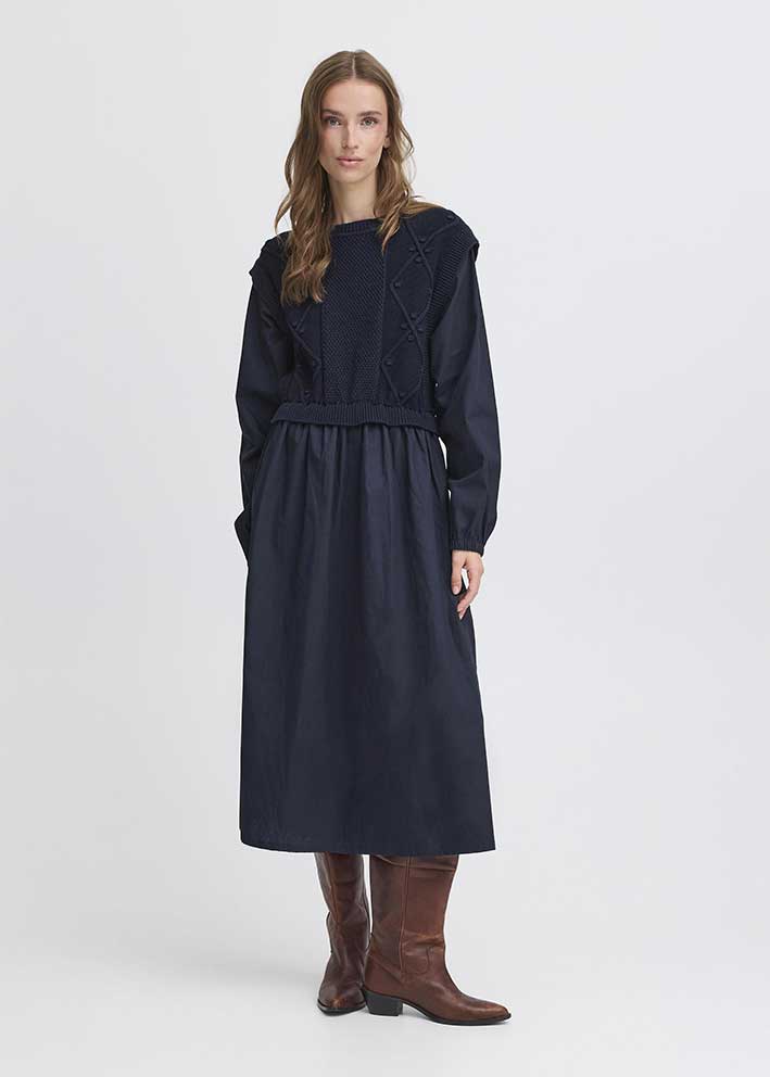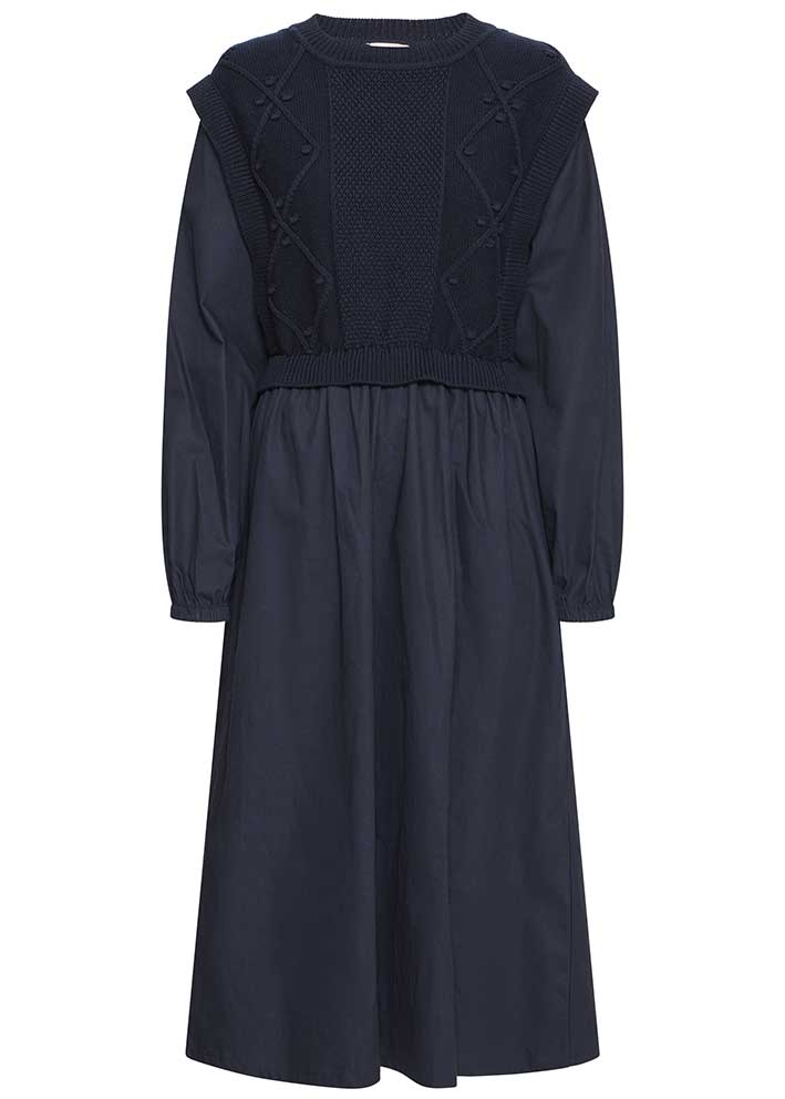Smuk navyblå Belle kjole fra Atelier Rêve, designet med strikket overdel, der giver et fint layer-look. Kjolen har rund hals, lange ærmer med elastik og længde til midt på underbenet.