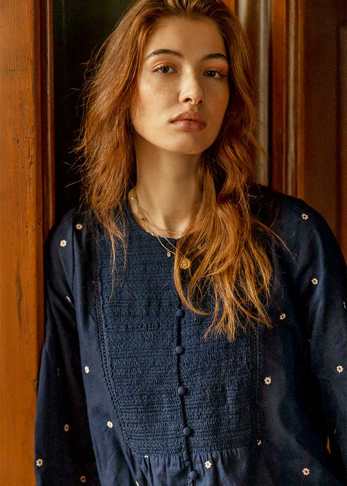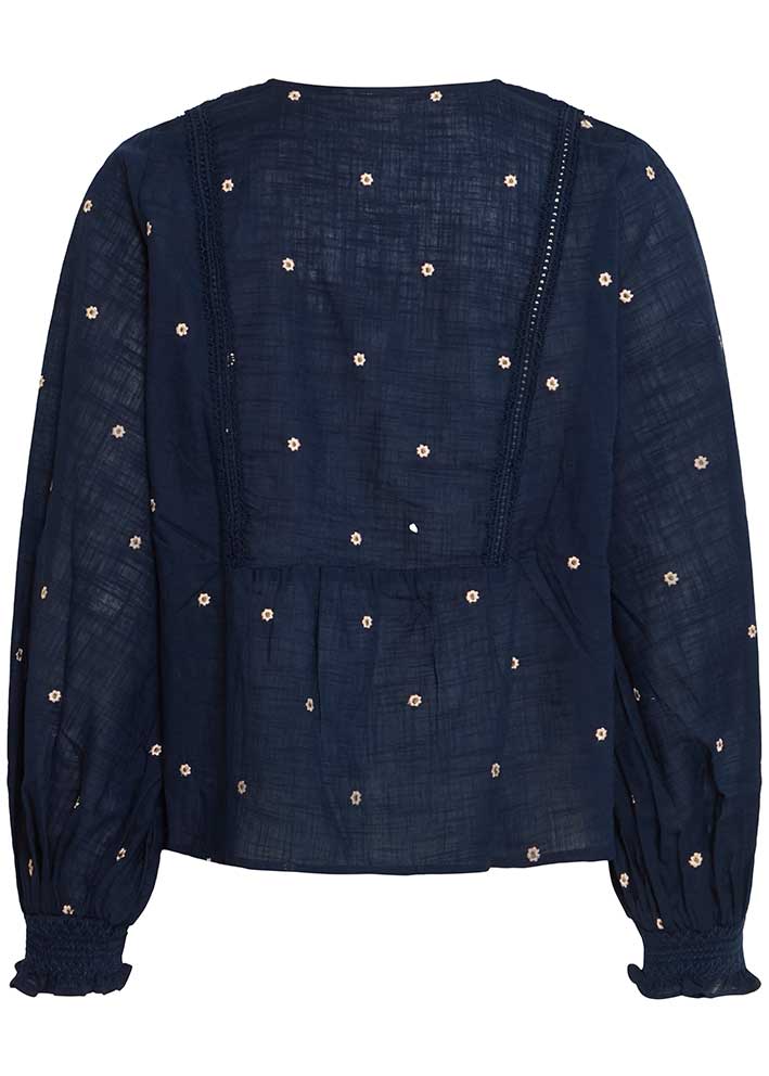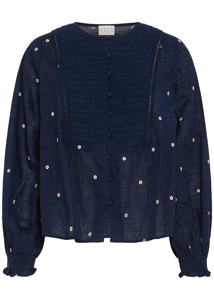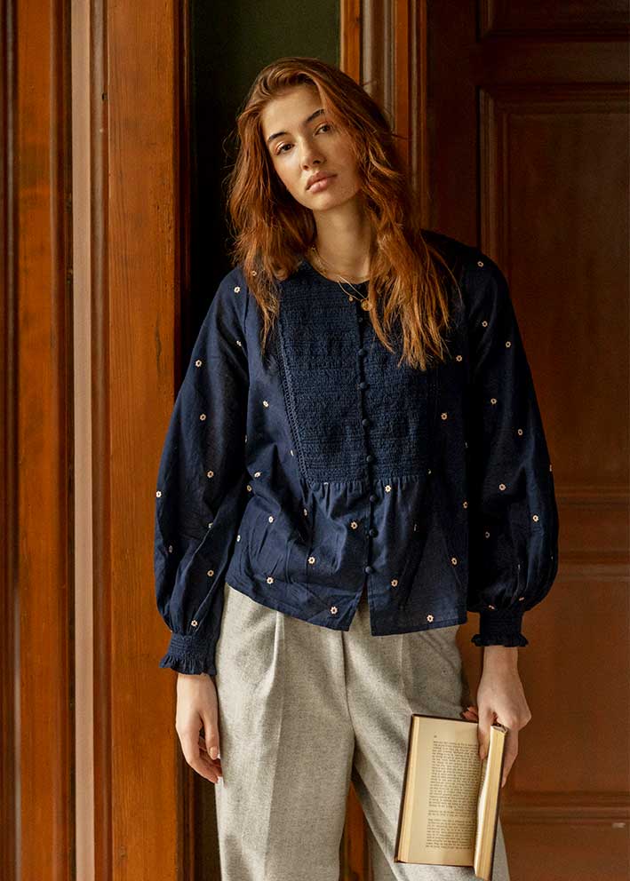 Smuk mørkeblå Galina skjorte fra Atelier Rêve, designet med stort smockbærestykke og de fineste små broderier all over. Skjorten har betrukne knapper ned foran og lange ærmer med smock- og flæsekant.