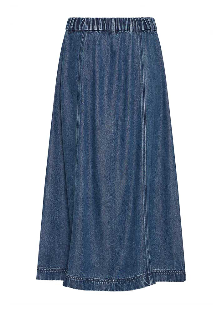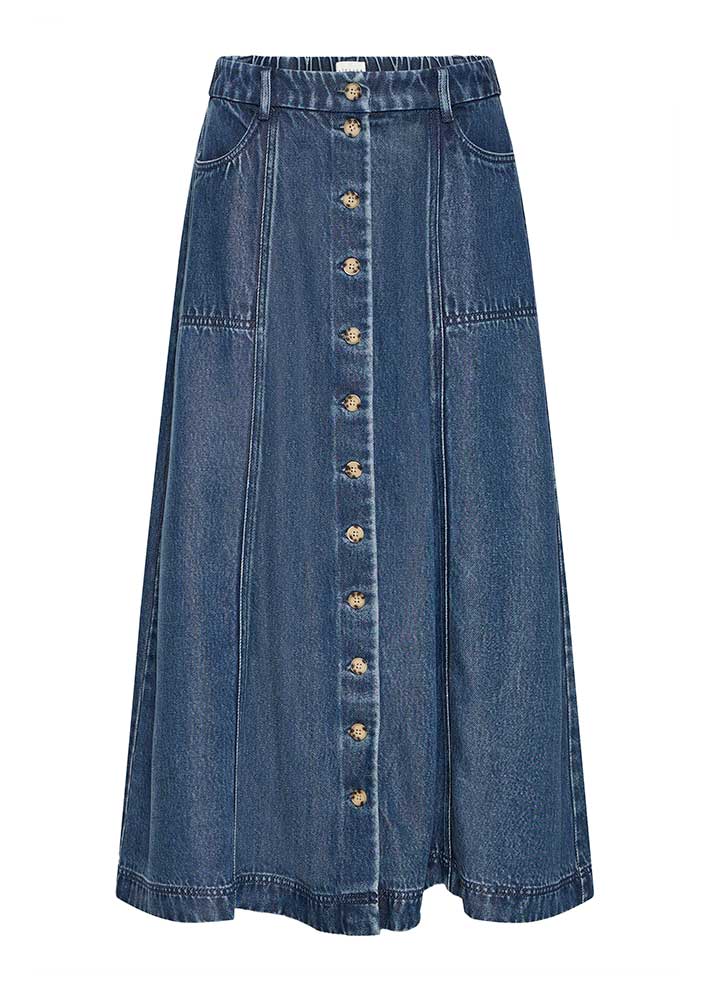 Skøn klassisk Risle nederdel fra Atelier Rêve, designet i et klædeligt A-snit med knapper ned foran, store lommer og talje med elastik på ryggen, der gør den fleksibel i pasformen.