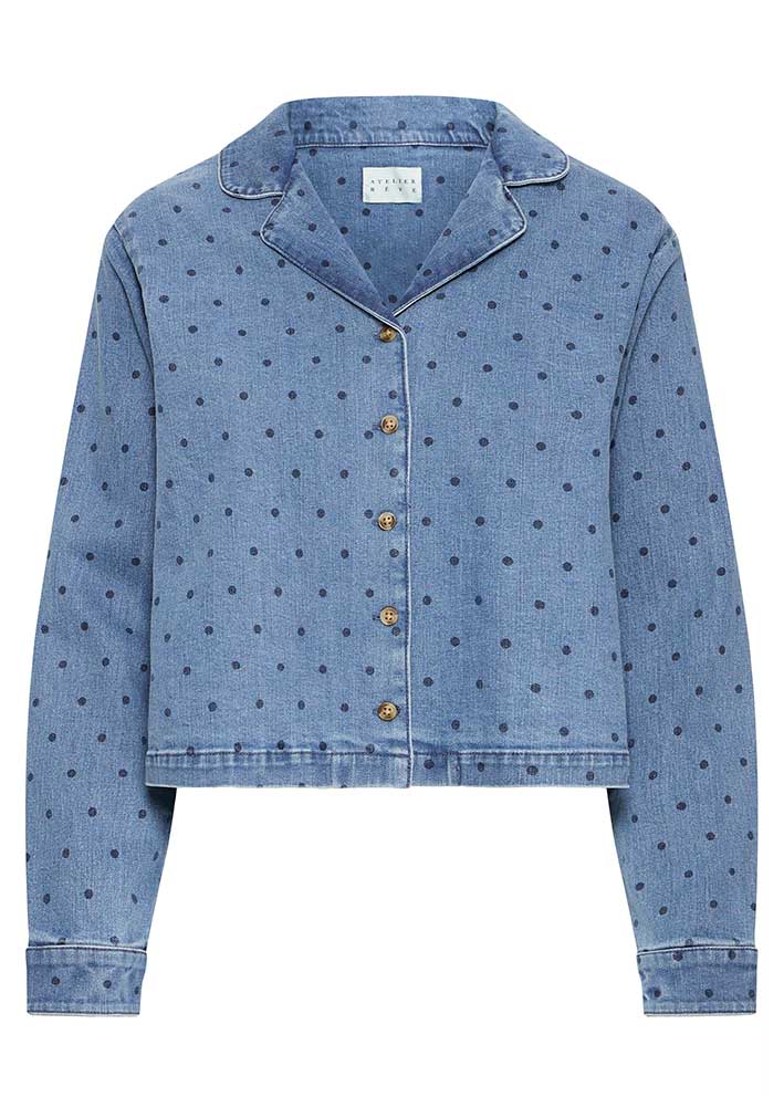Fantastisk lækker Caroline jakke fra Atelier Rêve, designet i et fikst boxy snit med lille krave og knapper ned foran. Jakken har et vasket look og fine små indvævede prikker, der giver den et unikt look.