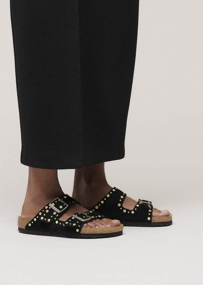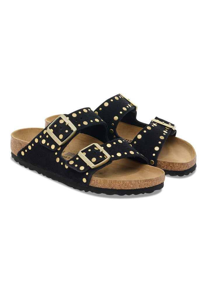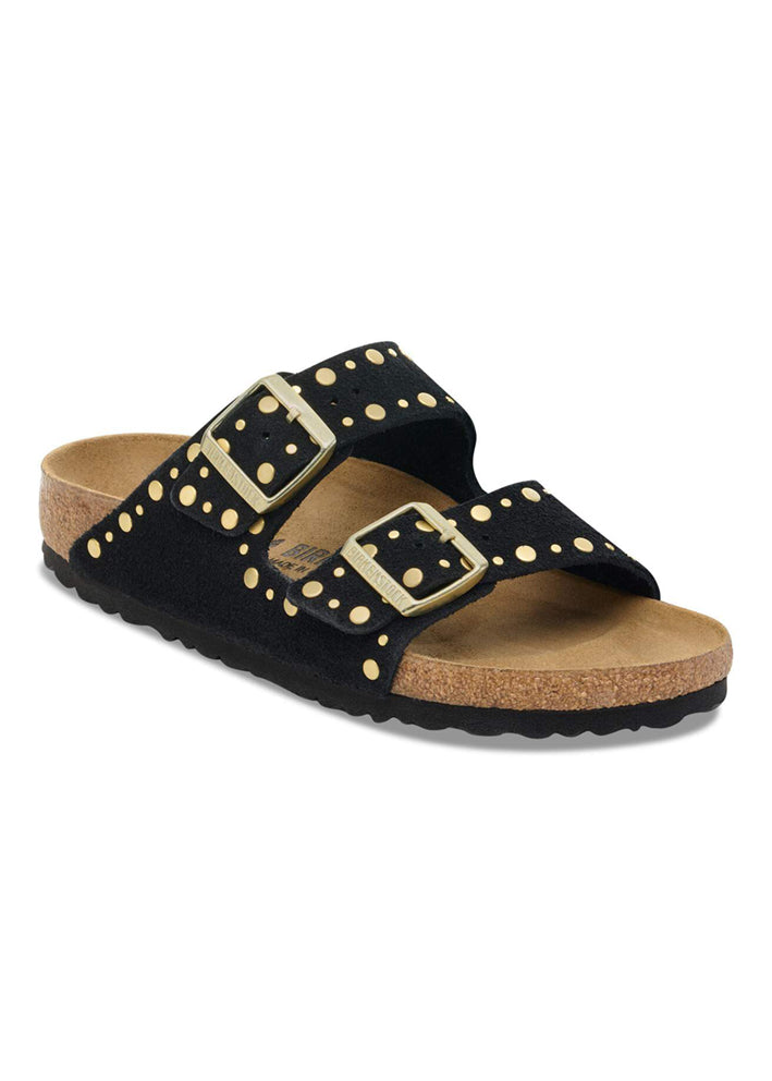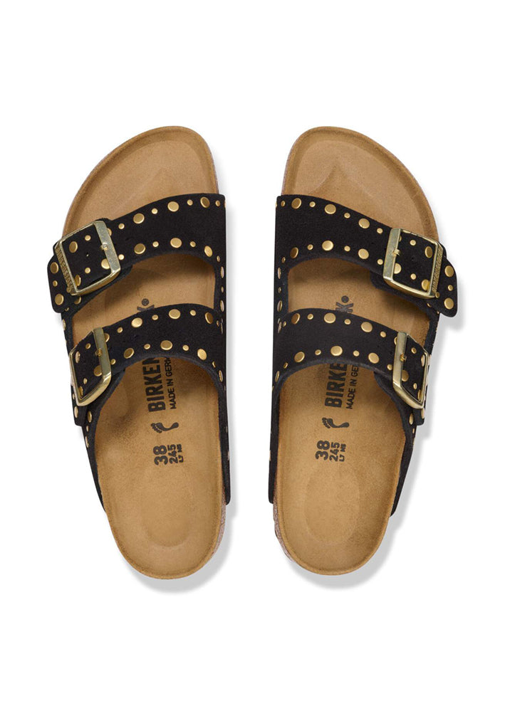 Birkenstock Arizona i sort ruskind med gyldne nitter. Arizona er en klassisk og superlækker kvalitetssandal fra Birkenstock, udført i ruskind med indersål i ruskind. De 2 regulérbare remme over foden sikrer at den sidder rigtig godt fast.
