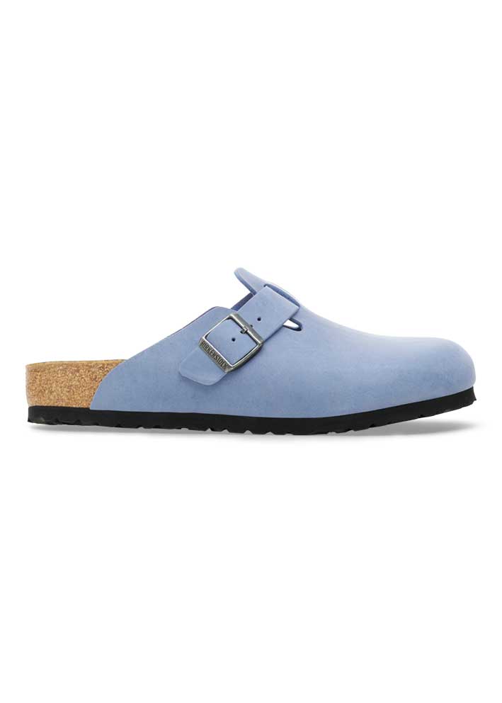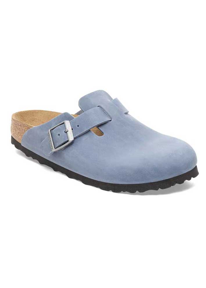 Birkenstock Boston i olieret læder* - En ægte klassiker fra Birkenstock - her i en smuk blå farve med rustik overflade. Skøn model, der kan anvendes hele året. Det lukkede design og den regulérbare rem over foden, gør at den sidder godt fast.