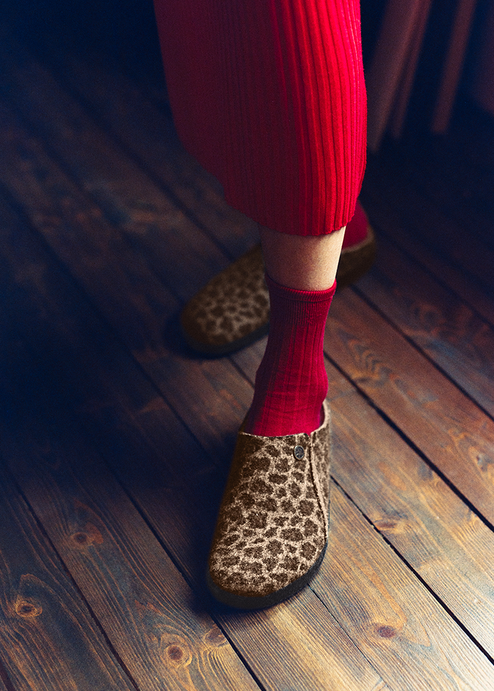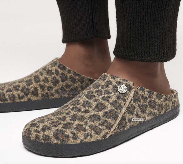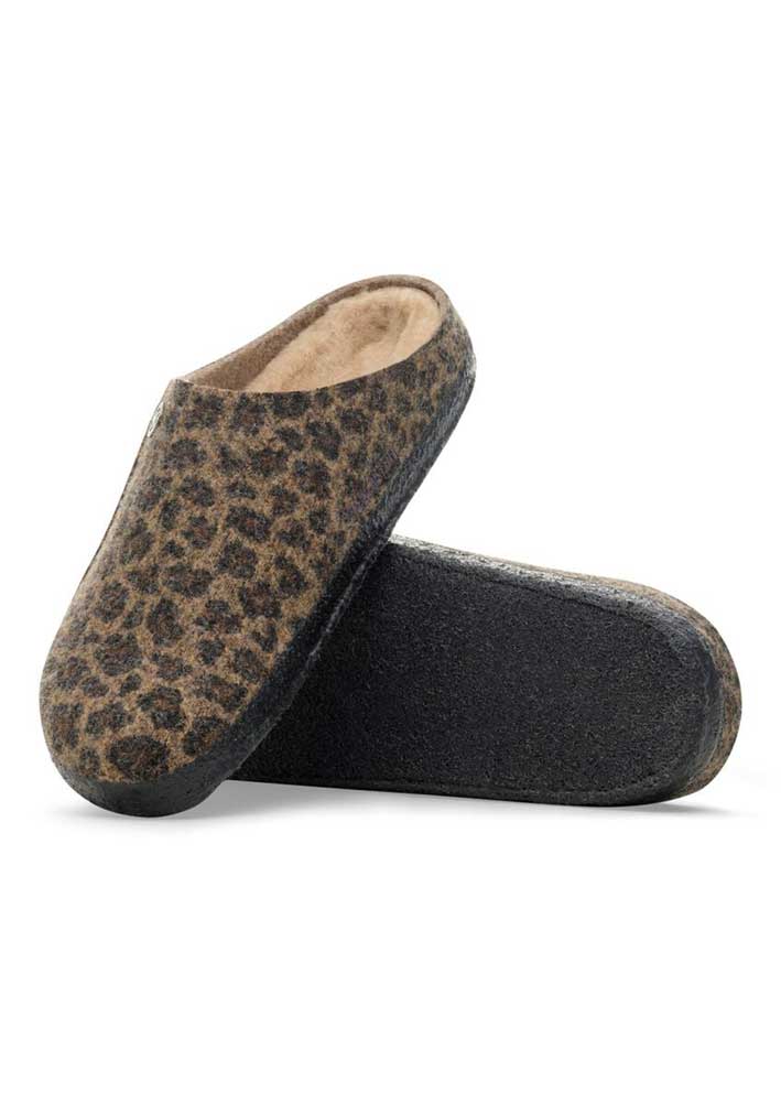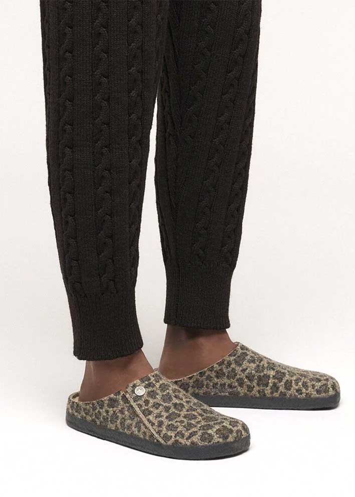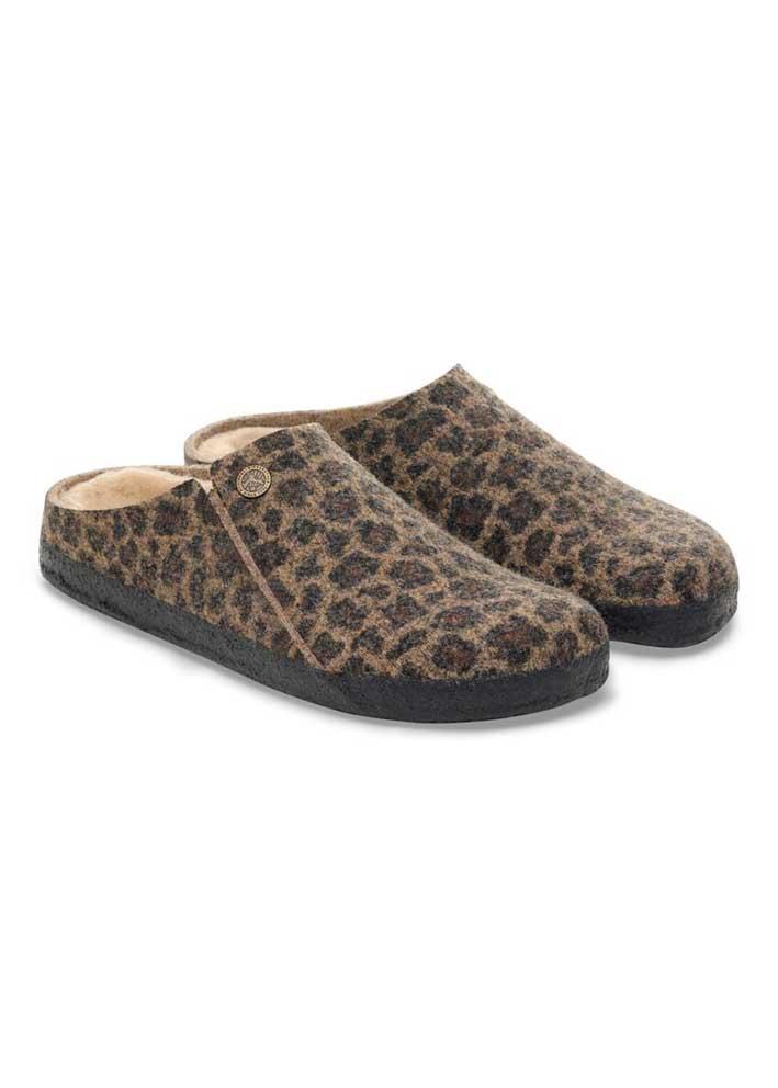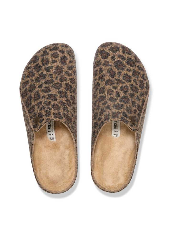 Superlækker leoprintet pelsforet Zermatt hjemmesko fra Birkenstock, fremstillet i lun uldfilt med udtagelig lammeskindsforing. Skoene er designet med den klassiske ergonomisk korrekte Birkenstock fodseng, som er meget behagelig at gå i.