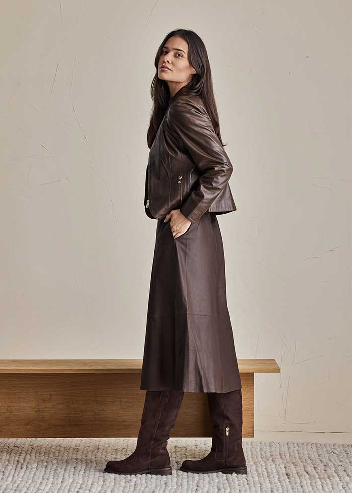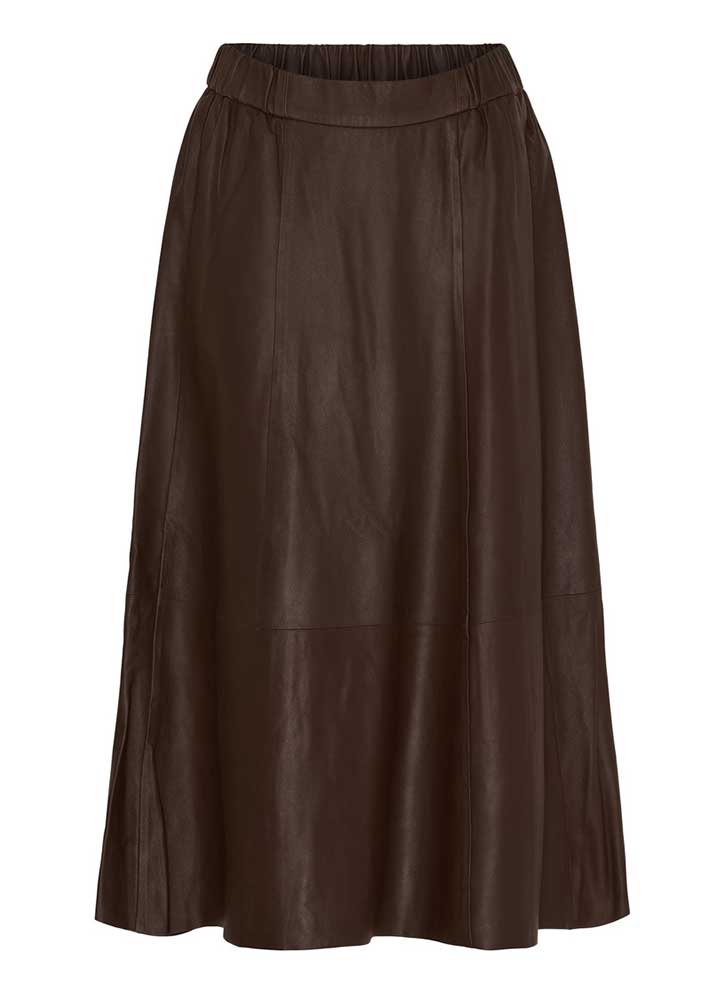 Superlækker mørkebrun skindnederdel fra BTF CPH, designet i A-snit med elastiktalje og lommer i siden.