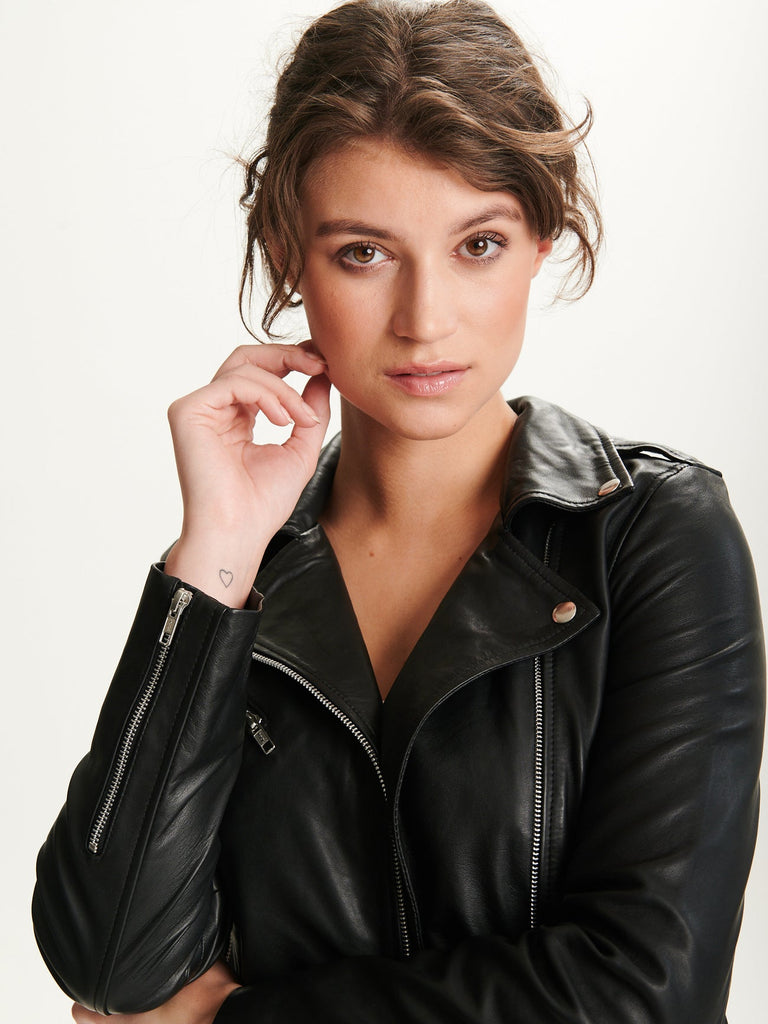 En rigtig klassiker: Superfed sort biker jakke fra BTF CPH, designet i det blødeste lammelæder i et velsiddende bikersnit med lækre rå detaljer i sølv.