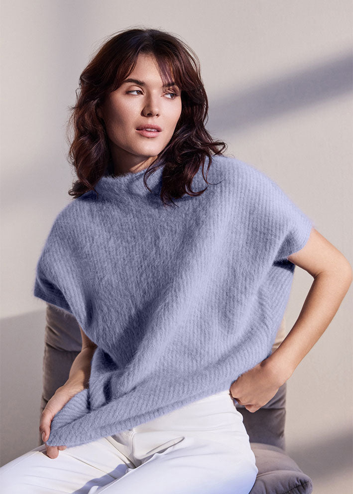 Fantastisk blød og lækker lyseblå Cashmere Raccoon strik fra BTF CPH, lavet af en eksklusiv blanding af cashmere- og vaskebjørns-garn. Blusen har en elegant lille høj hals og korte ærmer.