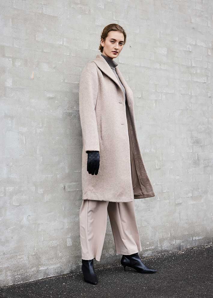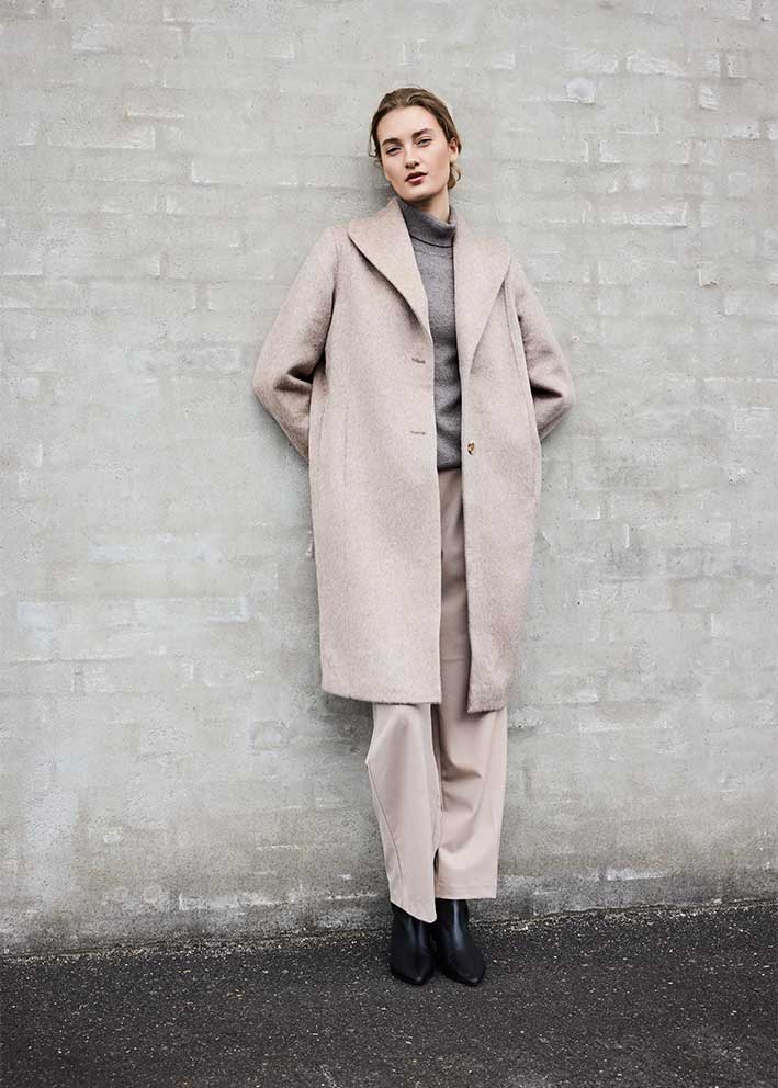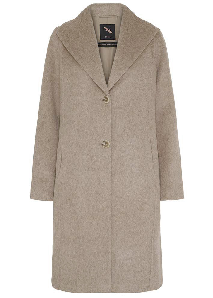 Ualmindelig smuk og elegant luksusfrakke fra BTF CPH, designet i en eksklusiv kvalitet af cashmere, silke og uld, der resulterer i en meget blød og let kvalitet, der både føles behagelig mod huden og giver naturlig varme.