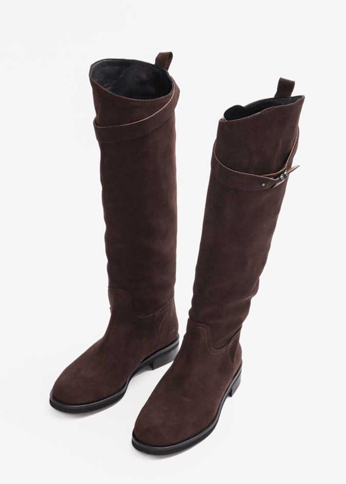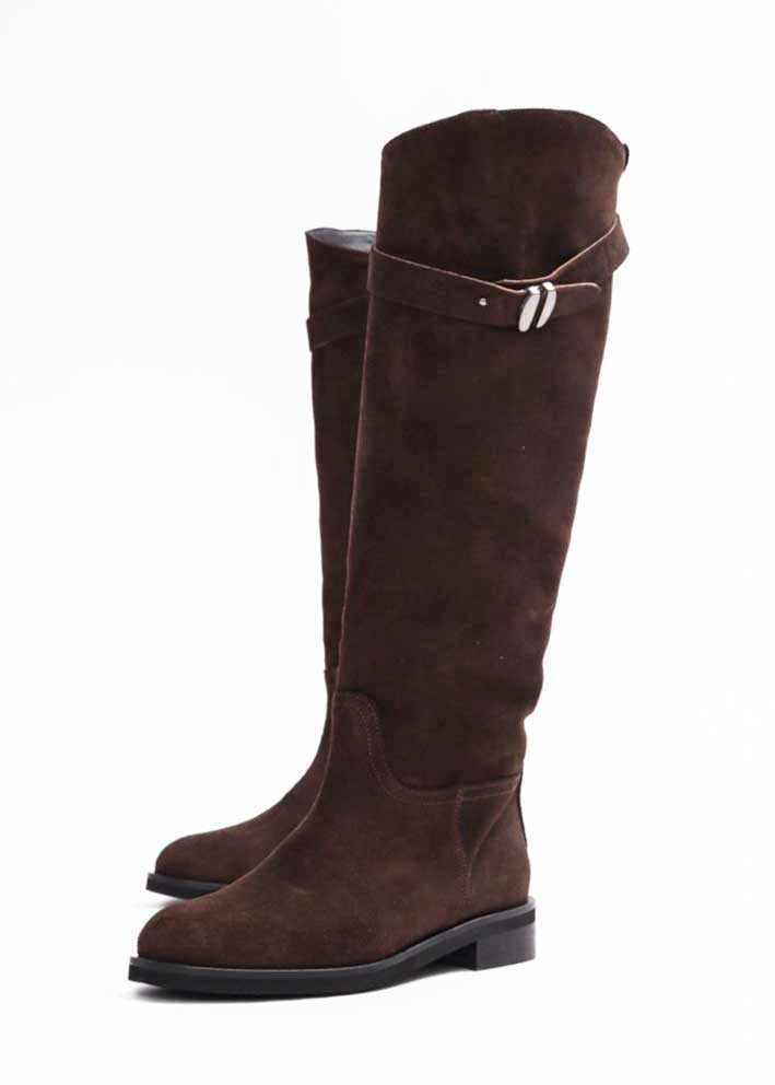 Skøn langskaftet Etta støvle fra Bukela, designet i mørkebrunt italiensk ruskind. Støvlen er stilren, let og lige til at hoppe i. Den har rund snude, afrundet kant foroven og en elegant detalje med rem og spænde samt hælstrop.