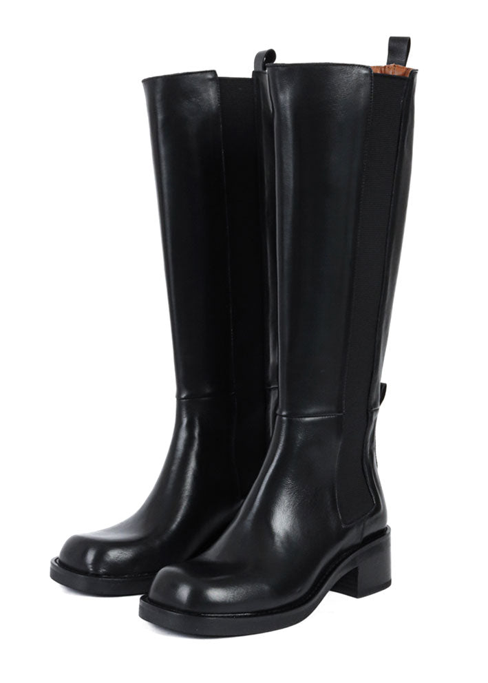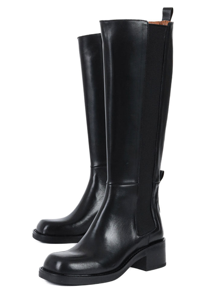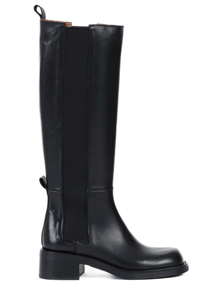 Skøn langskaftet sort Millers støvle fra Bukela, designet i lækkert glat skind. Støvlen er stilren, let og lige til at hoppe i. Den har afrundet kantet snude, chunky hæl, hælstropper samt brede elastikstykker i siden, der sikrer at støvlen sidder godt på benet.