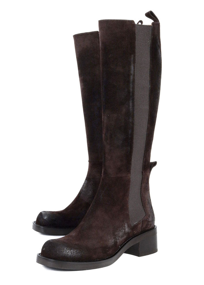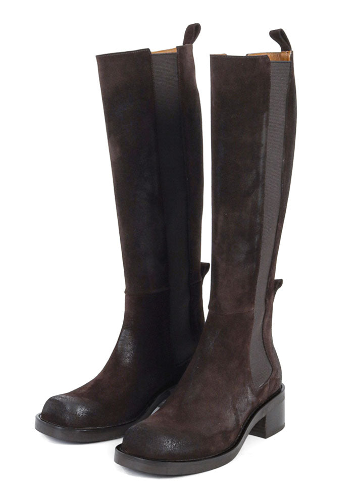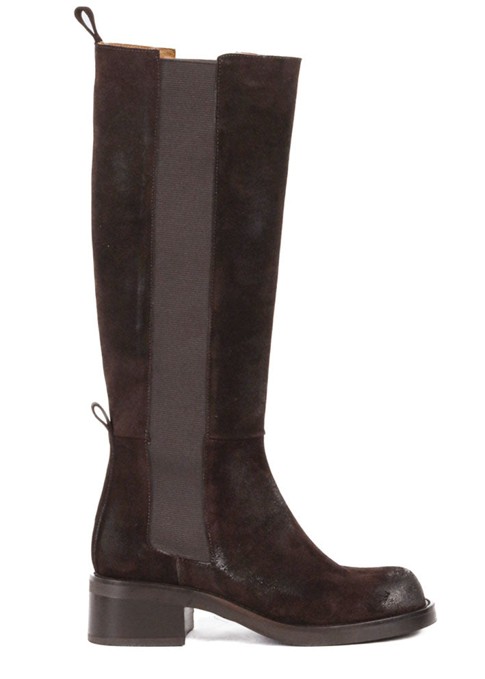 Skøn langskaftet mørkebrun Millers støvle fra Bukela, designet i lækkert russkind. Støvlen er stilren, let og lige til at hoppe i. Den har afrundet chunky hæl og kantet snude med brush-effekt, hælstropper samt brede elastikstykker i siden, der sikrer at støvlen sidder godt på benet.