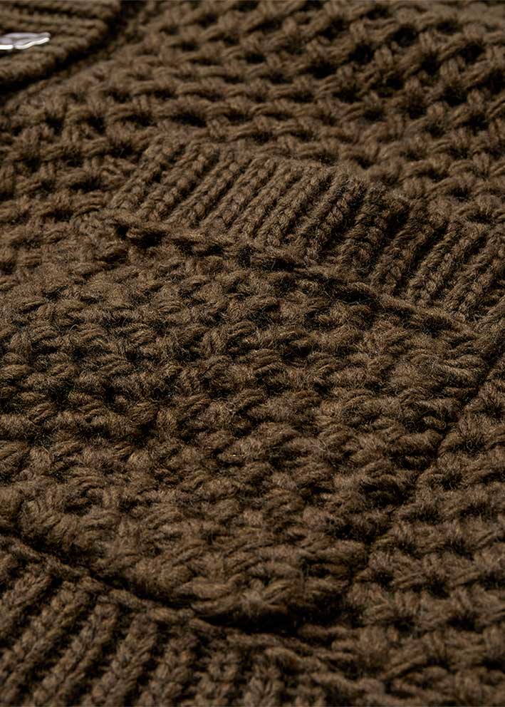 Skøn mønsterstrikket mørk olivengrøn Colette cardigan fra CPH Muse, strikket i en lækker kvalitet med uld. Cardiganen har en løs pasform, elegant struktur, 2 frontlommer samt stilfulde statement knapper, der understreget det eksklusive udtryk.