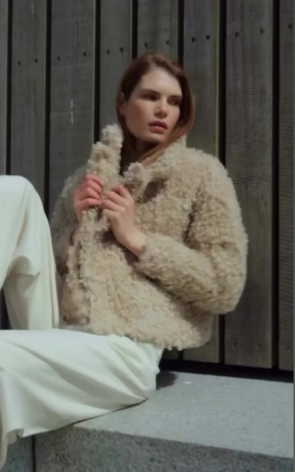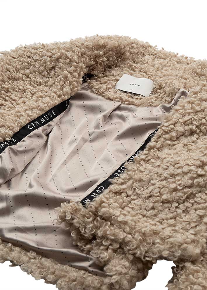 Smuk kort sandfarvet Curly fake fur jakke fra CPH Muse, designet i et boxy snit med stor krave og dobbeltradet lukning. Jakken er udført i en eksklusiv, naturtro krølhåret "fårepels", er foret, har lommer i siden og lange ærmer.
