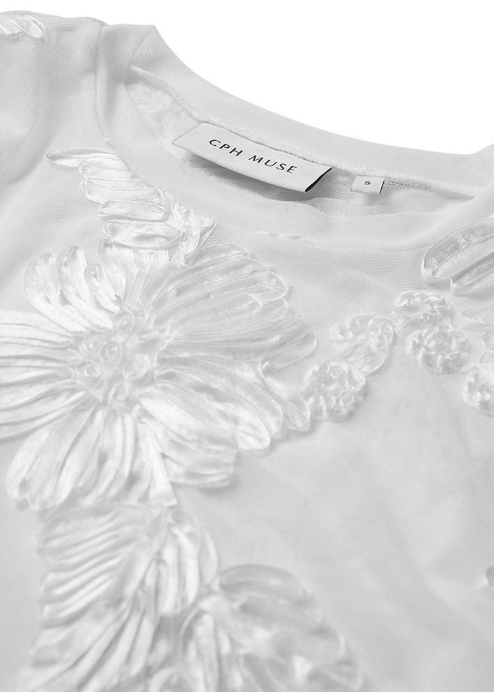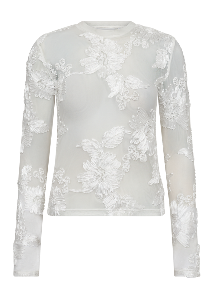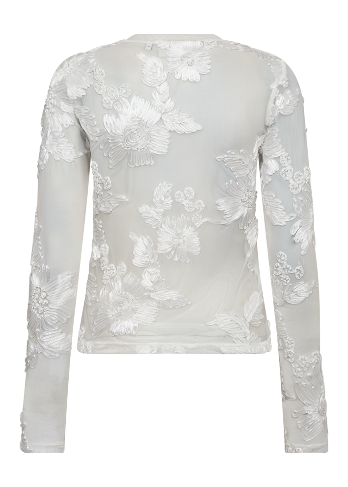 Elegant mesh-kvalitet med dekorativ blomsterstruktur der giver et sofistikeret og feminint udtryk. Rund halsudskæring og lange ærmer skaber en tidløs silhuet. Længde fra skulder er 56 cm.