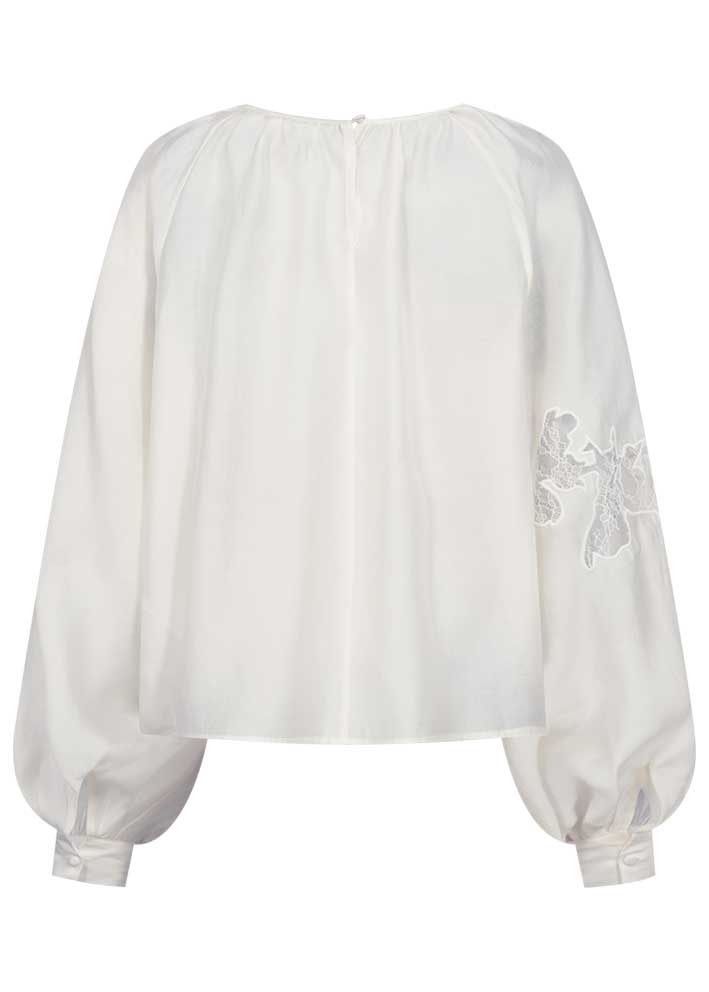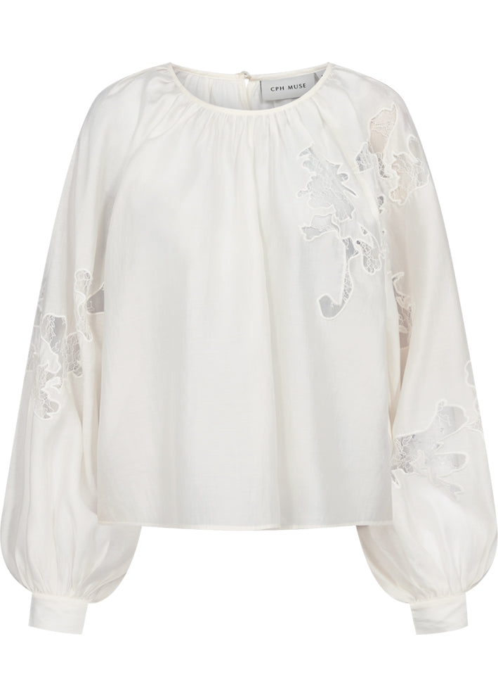 Umådelig smuk cremehvid Molly bluse fra CPH Muse, designet i en eksklusiv kvalitet. Bluse har lange, voluminøse ærmer med en smal manchet, slids med knap i nakken, rynk i halsudskæringen samt cut-and-sew blonder, der giver et elegant sneak peek til huden.