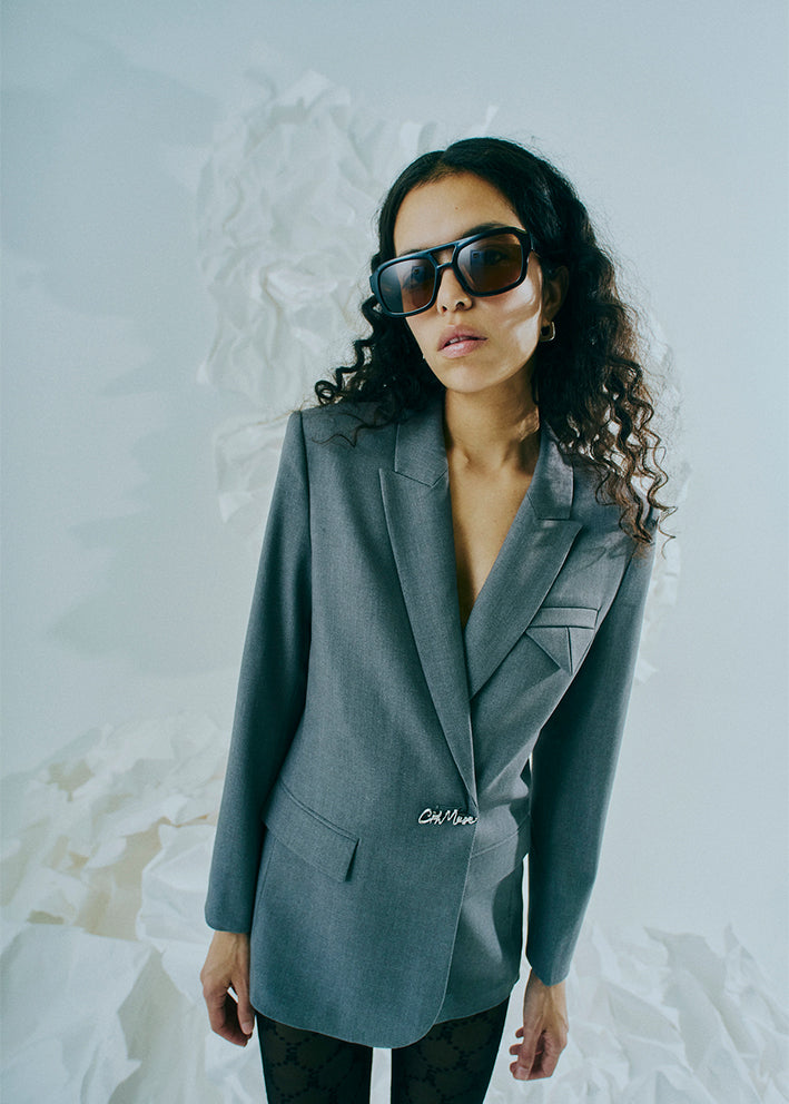 Elegant klassisk gråmeleret Tailor blazer fra Copenhagen Muse. Blazeren har et klassisk snit med stort revers, klaplommer og enkeltknapslukning. Desuden fin lille effekt ved brystlommen.