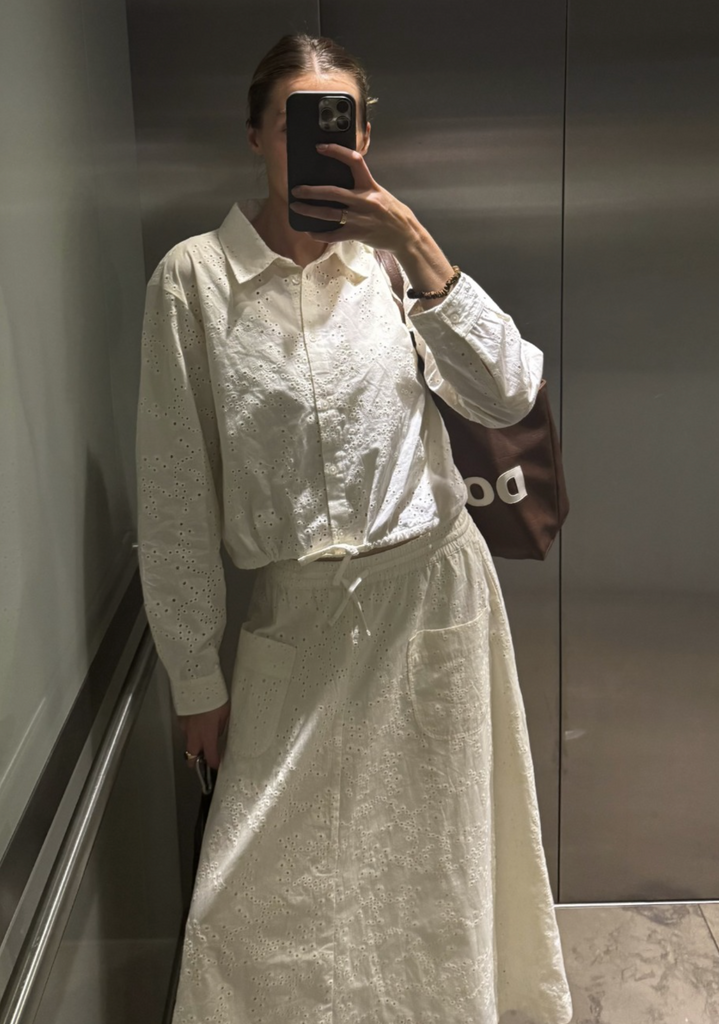 Skøn cremefarvet Leo skjorte fra Esmé Studios, designet i 100% GOTS certificeret økologisk bomuld i et smukt Broderie Anglais mønster.. Skjorten kombinerer en klassisk krave og lange ærmer med snøre forneden for justerbar styling.