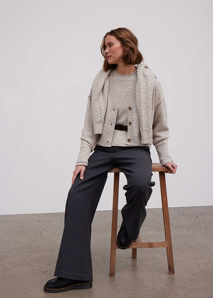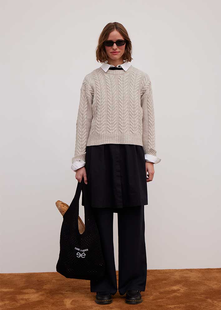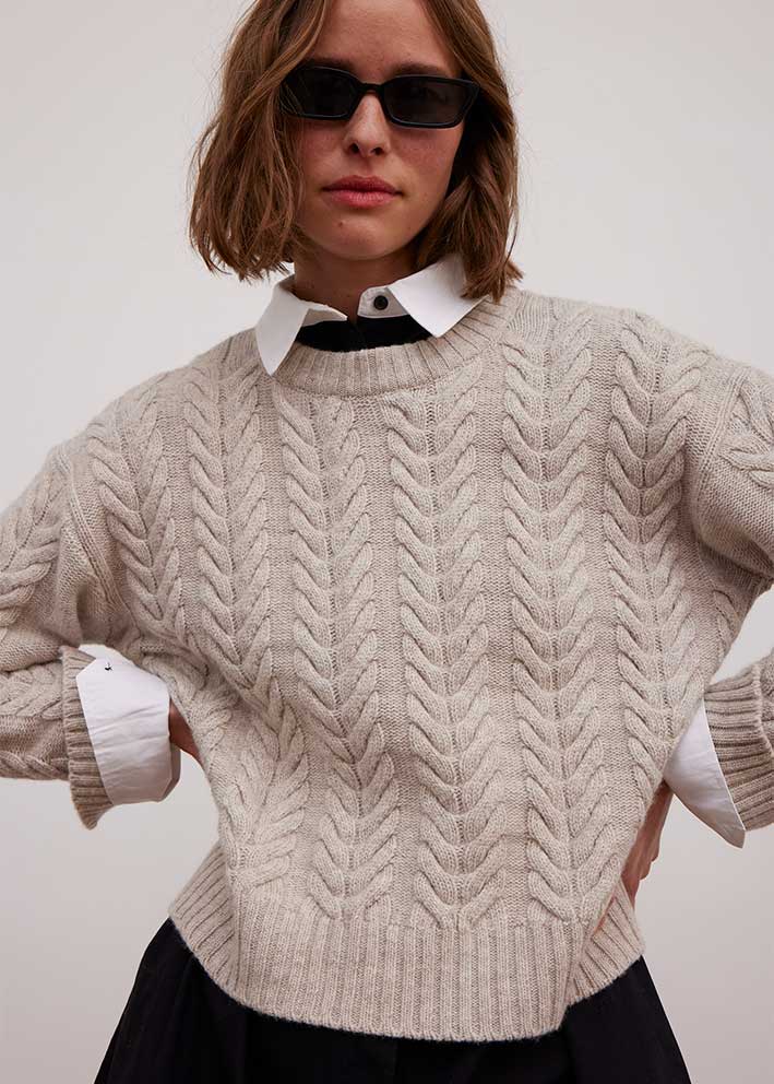 Skøn kabelstrikket Elida sweater fra Esmé, designet i en blød og lun lambswool-kvalitet. Sweateren har et klassisk snit med rund hals, droppede skuldre, lange ærmer og ribbede kanter.