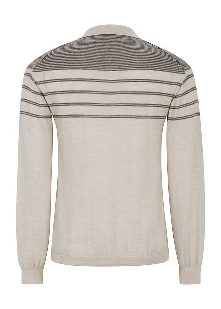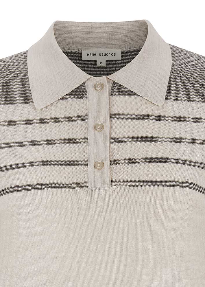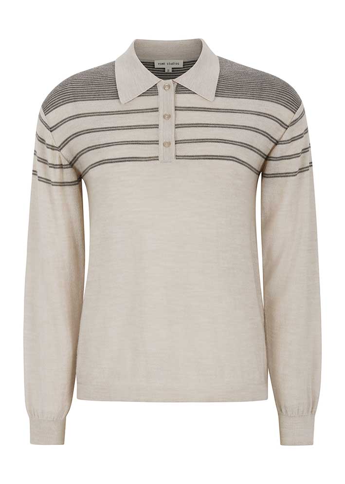 Smuk og lun Jill polostrik fra Esmé Studios, finstrikket i en lækker merinokvalitet. Strikken har et klassisk snit med lille krave, stolpelukning med knapper, lange ærmer med ribkant og striber på det øverste stykke.