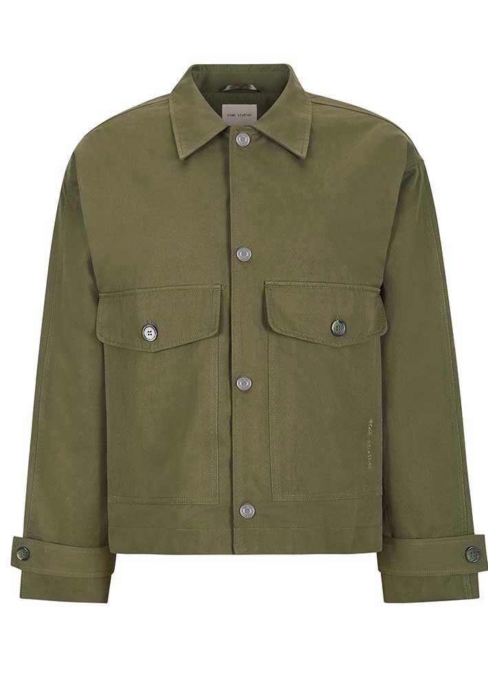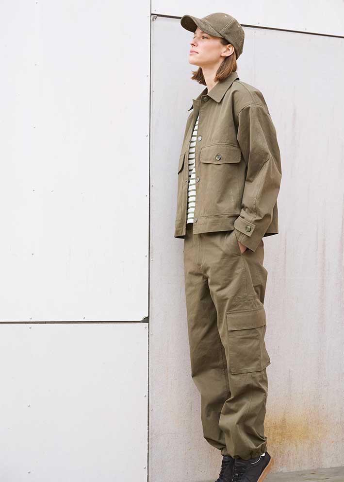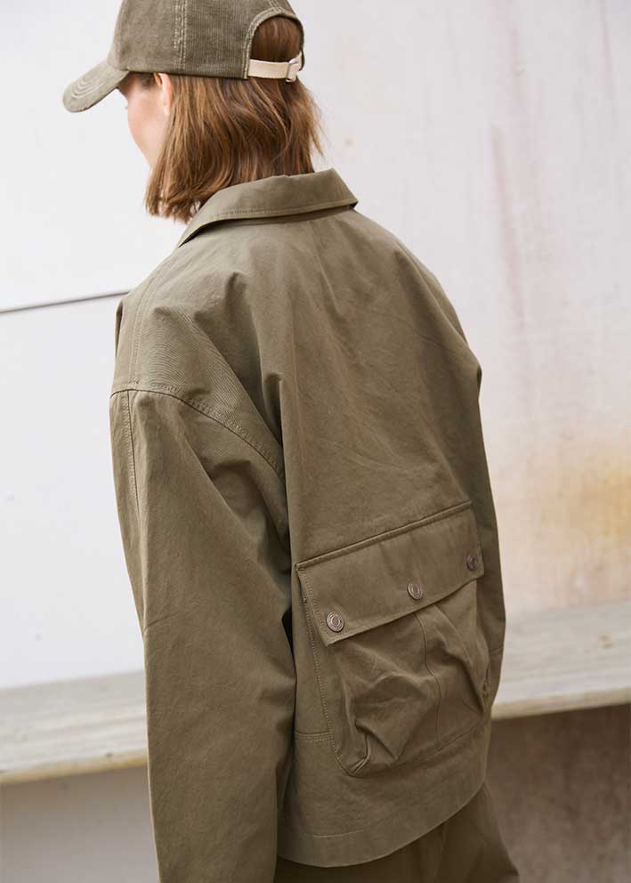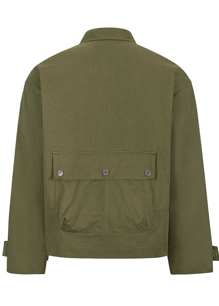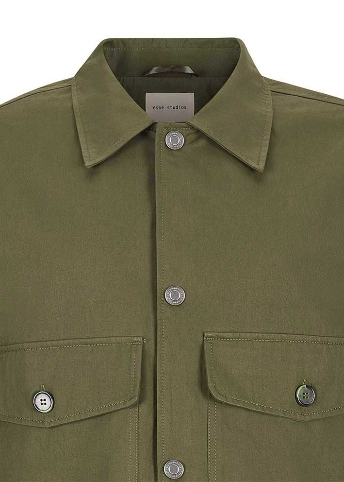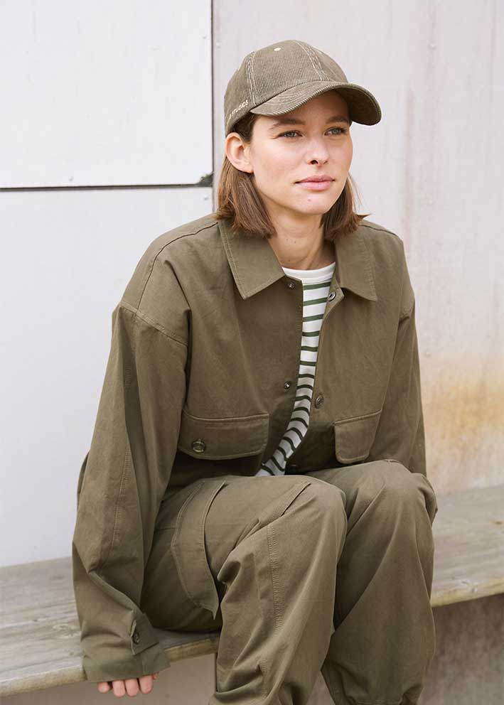Cool mørkegrøn Jodi cargojakke fra Esmé Studios, designet i 100% økologisk bomuld. Modellen har et rummeligt snit, lange ærmer med stropper ved håndleddet samt store lommer med klap og knap foran. Jakken lukkes med knapper og har desuden fiks lomme med klap og knap på ryggen.