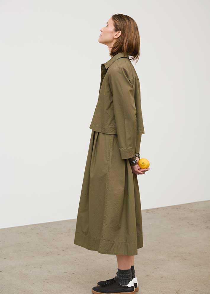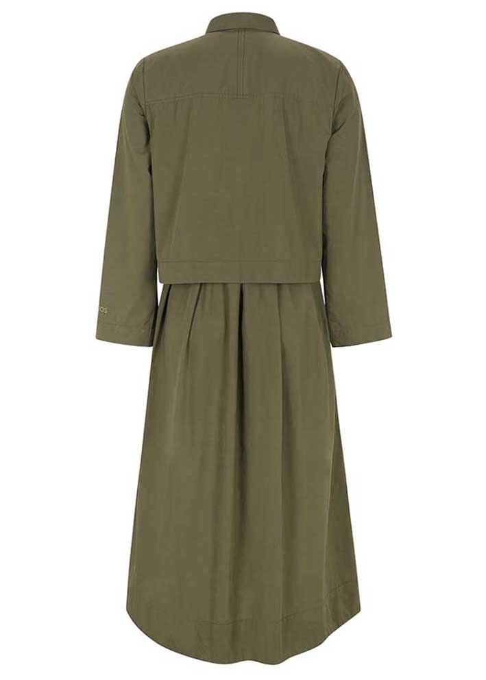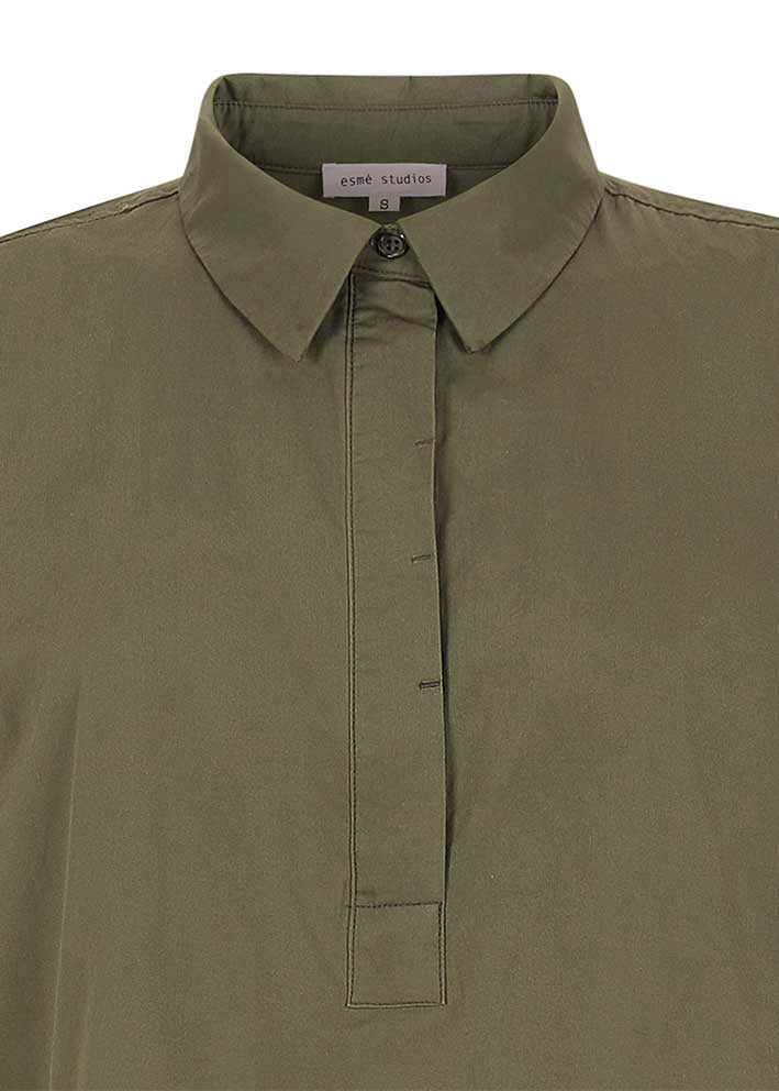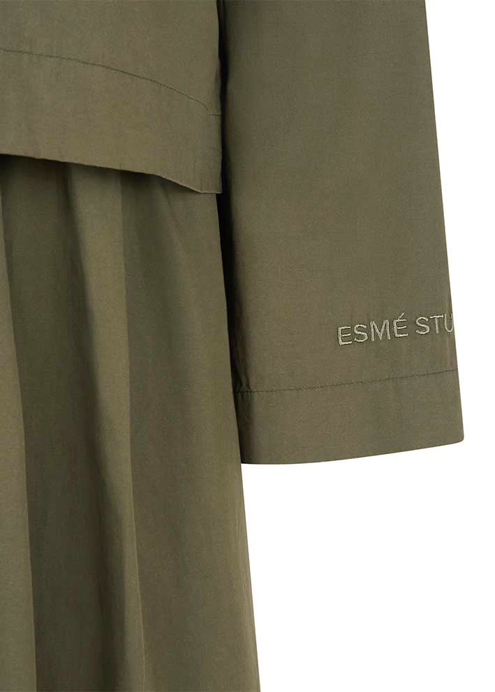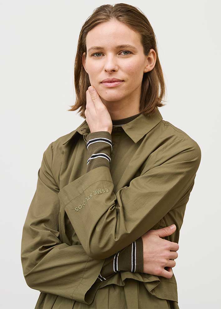 Skøn mørkegrøn Amira skjortekjole fra Esmé Studios, designet i 100% økologisk bomuld. Modellen har et rummeligt snit, lange vide ærmer, lille skjortekrave og stolpelukning med skjulte knapper. Kjolen er konstrueret i to lag, så det ligner en skjorte i overdelen - og underdelen har læg og god vidde, så den falder flot.