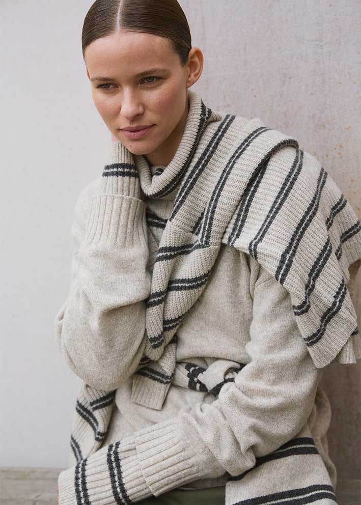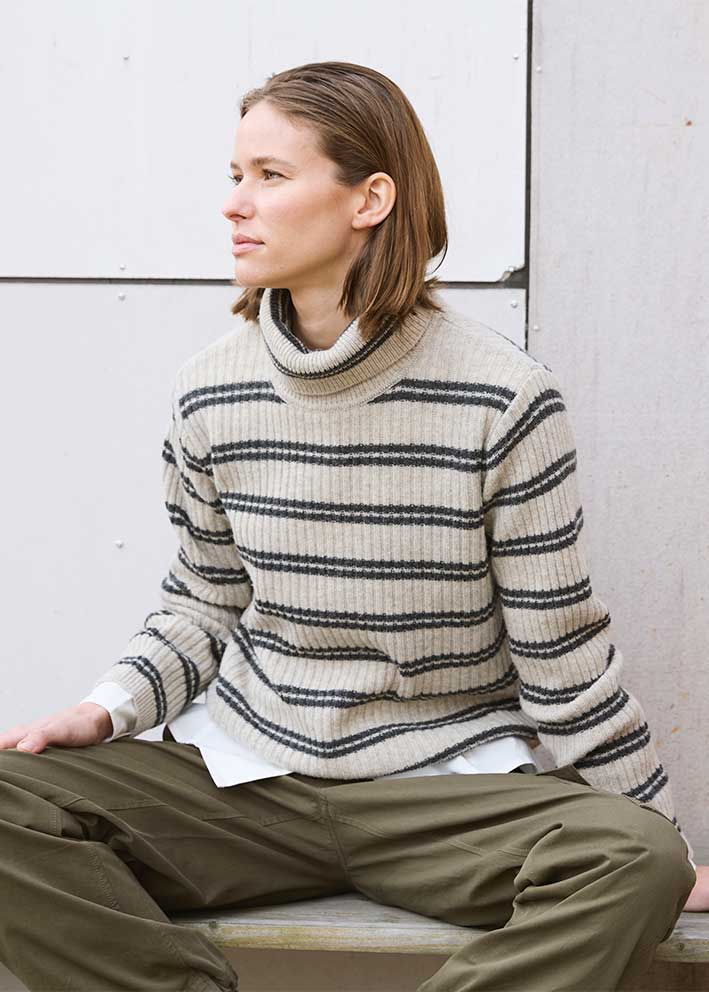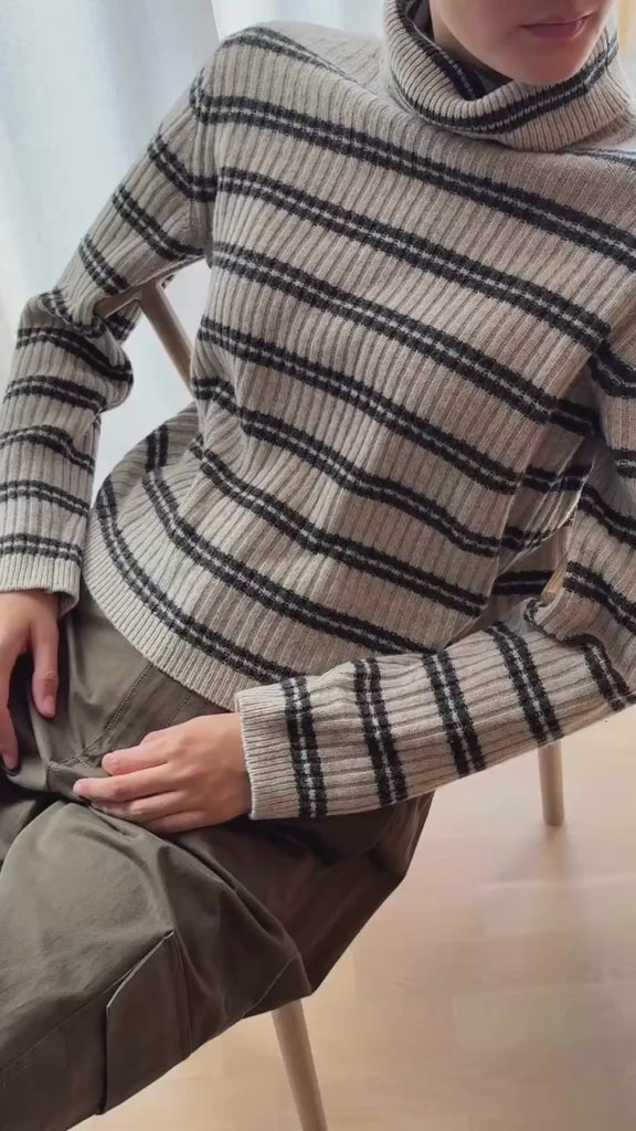 Skøn ribstrikket stribet Firo rullekrave-strik fra Esmé Studios, strikket i 100% merinould. Sweateren har et klassisk enkelt snit med høj hals, lave skuldersømme, lange ærmer og knapper ned foran samt ribbede kanter.