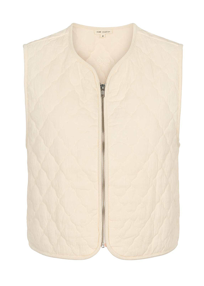 Smuk cremefarvet Uma vest fra Esmé Studios, udført i et lækkert quiltet design. Vesten har et enkelt snit, buet rund hals og lynlås foran. Det fine let buede quiltmønster giver jakken et feminint udtryk.