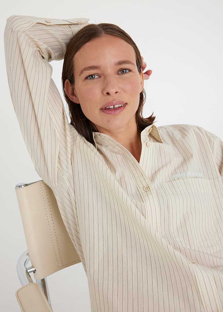 Willa-skjorten fra Esmé Studios er sommerens must-have i en elegant creme-farve med diskrete striber. Skabt i 100% GOTS-certificeret økologisk bomuld, der kombinerer nordisk minimalisme med bæredygtig luksus.