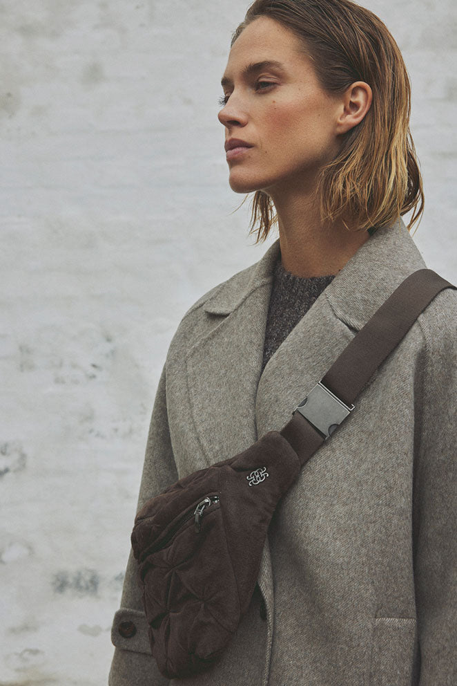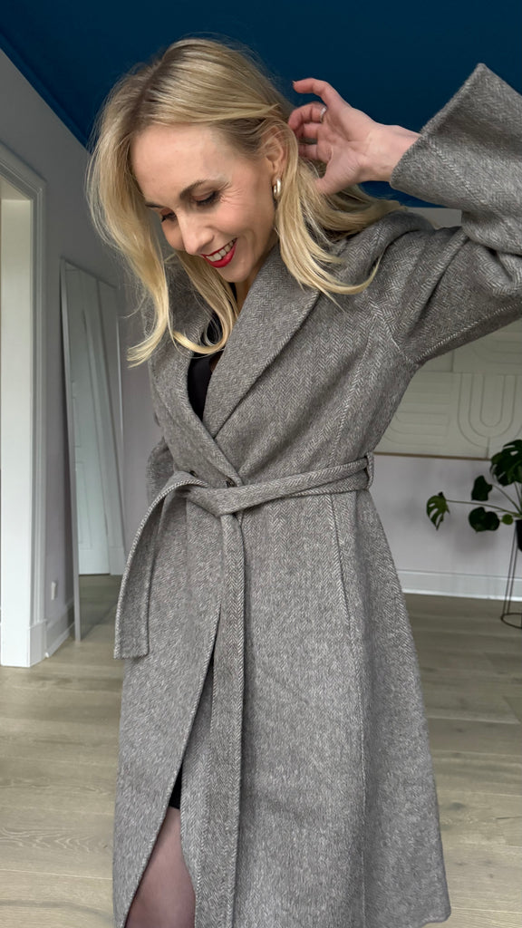Smuk og elegant sildebensvævet gråbrun Janicel uldfrakke fra Gustav, designet i et enkelt snit med stort hak-revers, knaplukning, lange ærmer, lommer i siden og bindebælte.