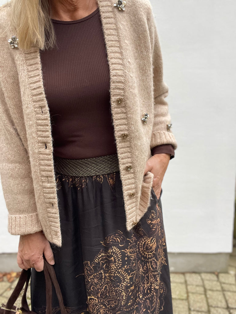 Perfekt at kombinere med en enkelt overdel, en vamset strik eller for et komplet sæt, den matchende Sikka skjorte eller som her, med Miam cardigan eller Came cape/strik.