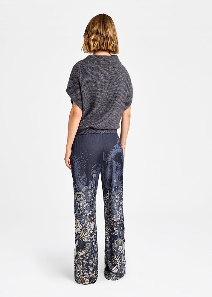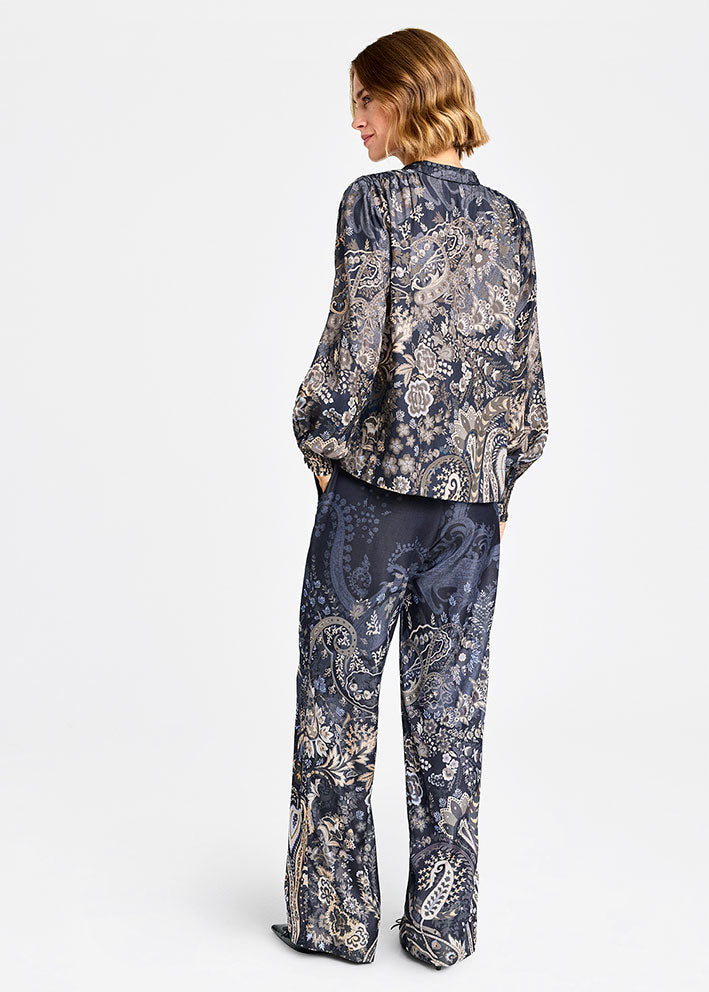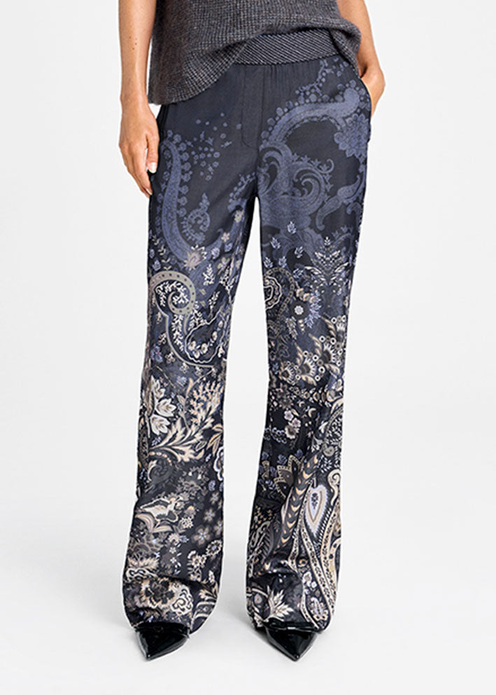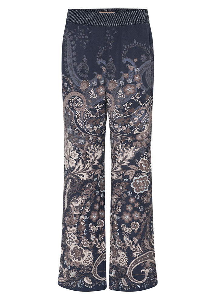 Smukke mørkeblå paisleyprintede Bay bukser fra Gustav, designet i en skøn stretchy kvalitet. Modellen er løstsiddende, har en behagelig bred elastiktalje og en elegant og samtidig afslappet udstråling, der gør at de kan bruges både til fest og hverdag, alt efter hvad du kombinerer med.