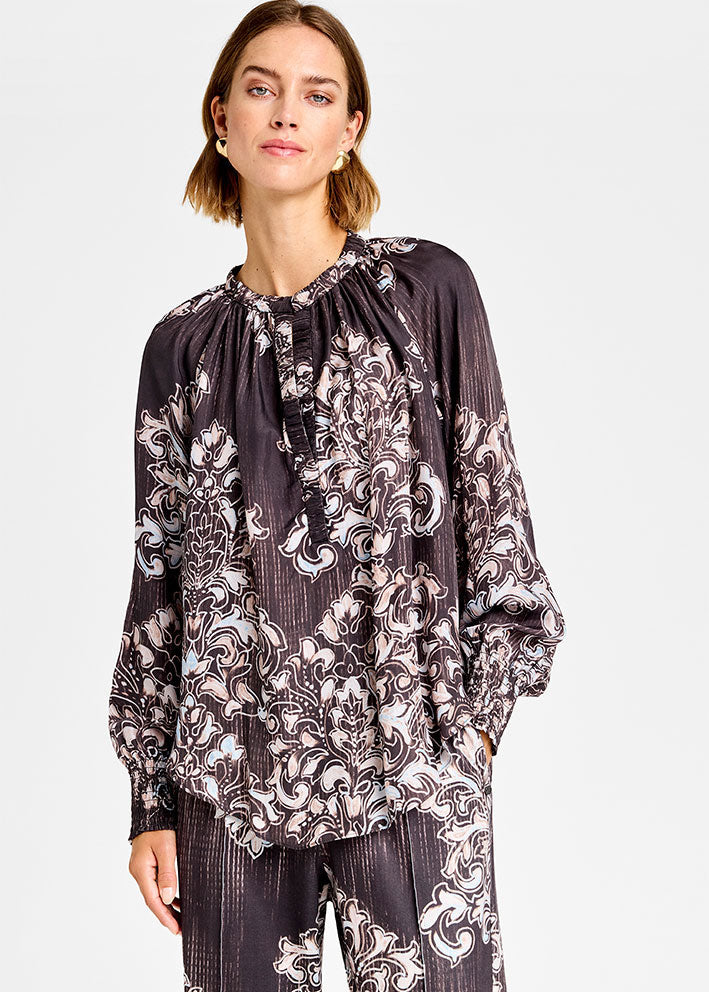 Matcher Annebell blusen i samme print. Og her kombineret med den smukke Emja strik.
