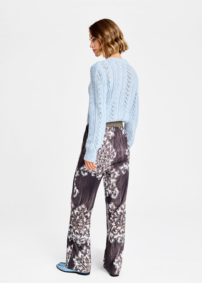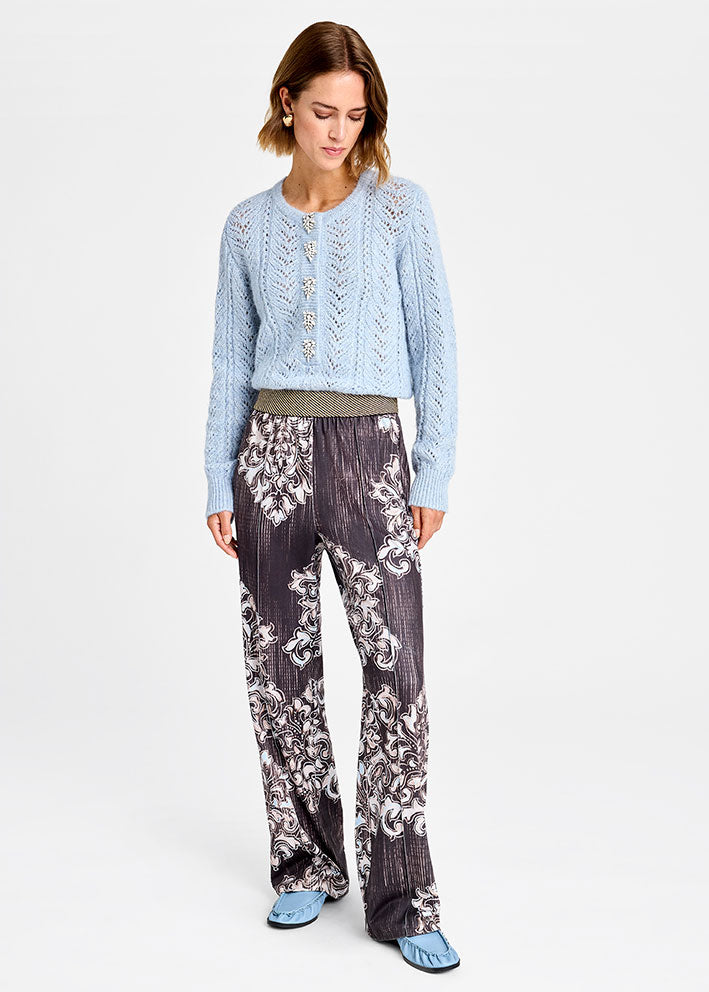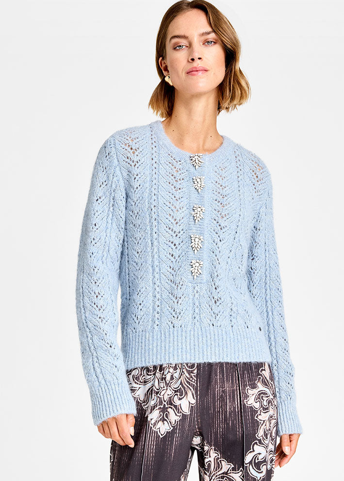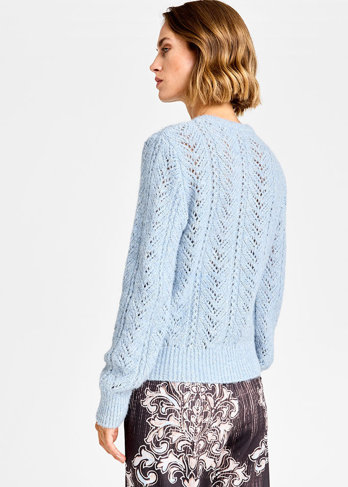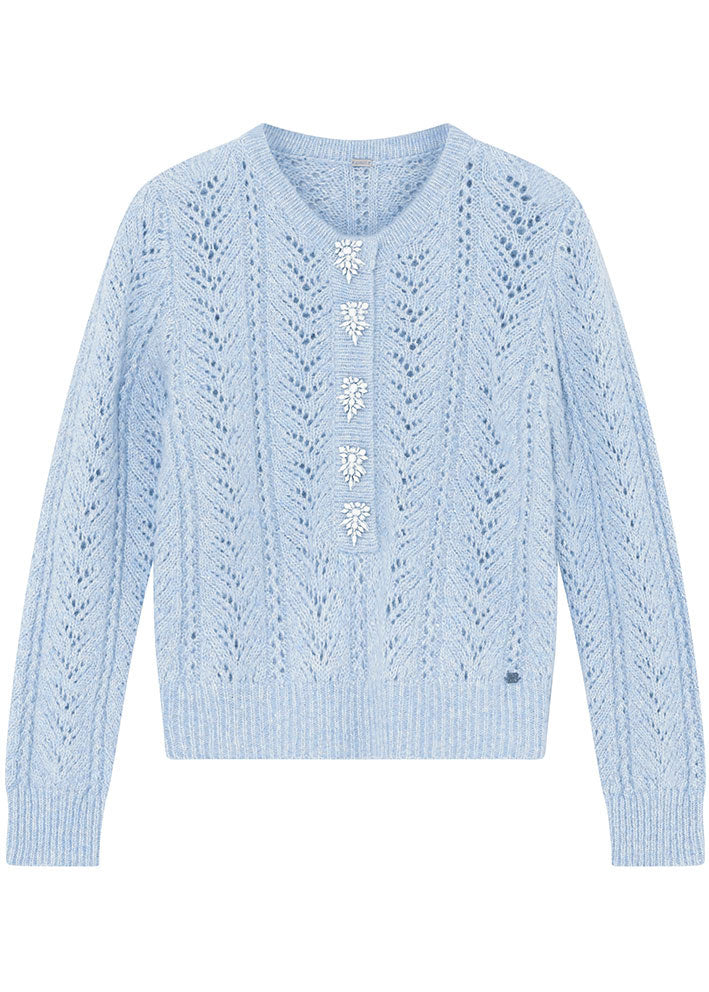 Umådelig smuk og feminin lyseblå Emja strik fra Gustav, mønsterstrikket i en lækker kvalitet med uld og alpaka. Sweateren har et helt enkelt snit med rund hals og lange ærmer og de mest fantastiske knapdetaljer, der fanger øjet og giver den et virkeligt eksklusivt udtryk.