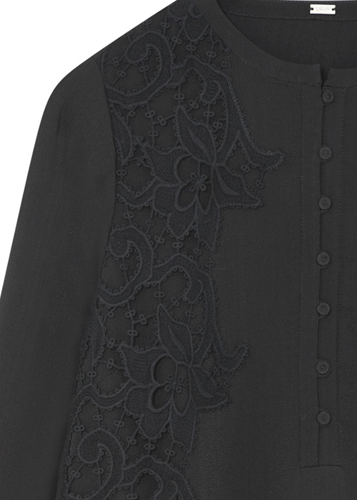 Umådelig smuk og elegant sort Madonna kjole fra Gustav, designet i et enkelt stilrent snit med de fineste detaljer: Stolpelukning med betrukne knapper og unikke påsatte broderede blonder på bryst og ærmer.