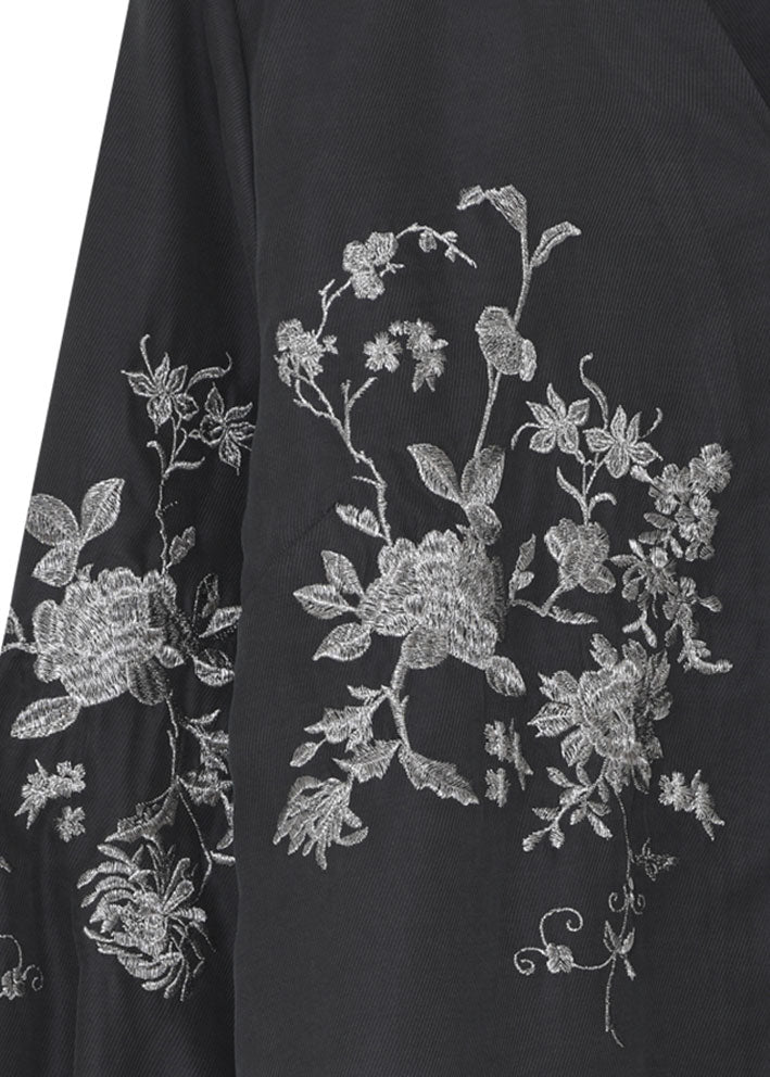 Umådelig smuk mørkegrå Naja skjorte Gustav, designet i en lækker cupro/lyocellkvalitet med eksklusive sølvgrå blomsterbroderier, der giver den et helt unikt udtryk. Skjorten har en feminin snit med lille stående krave med flæsekant, v-hals, betrukne knapper og lange ærmer med smockmanchet.
