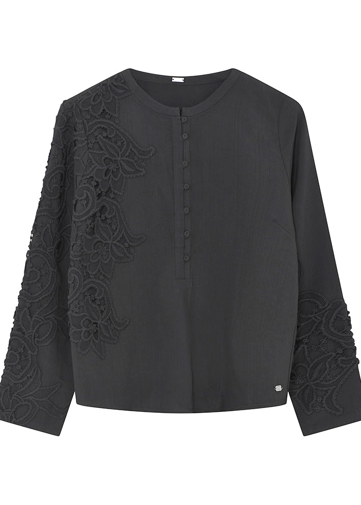 Umådelig smuk og elegant sort Cana bluse fra Gustav, designet i et enkelt stilrent snit med de fineste detaljer: Stolpelukning med betrukne knapper og unikke påsatte broderede blonder på bryst og ærmer.