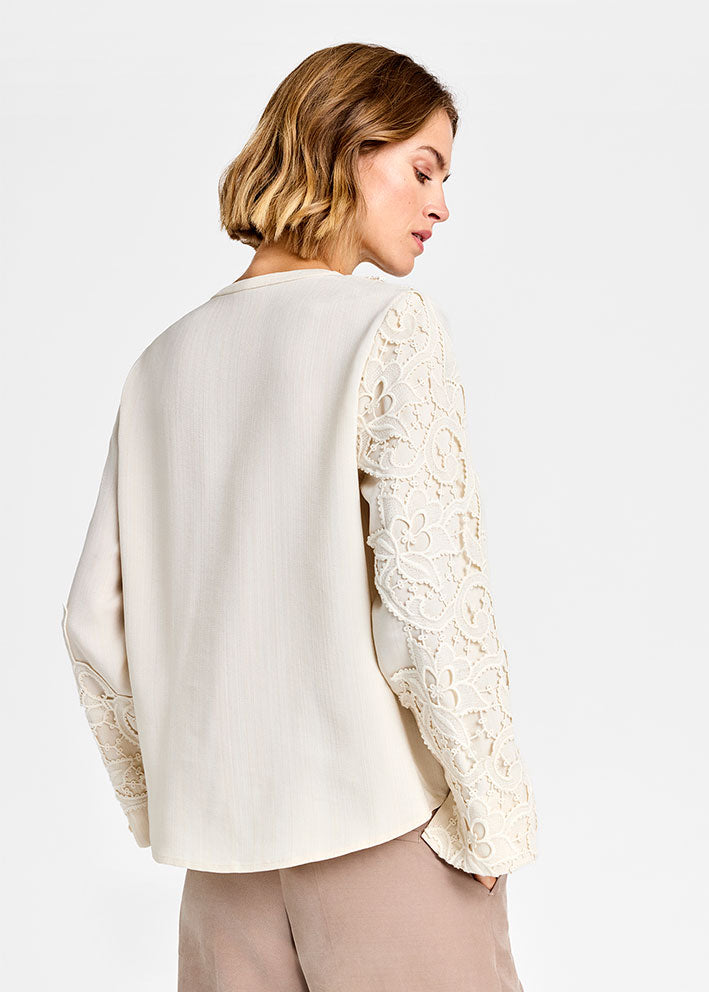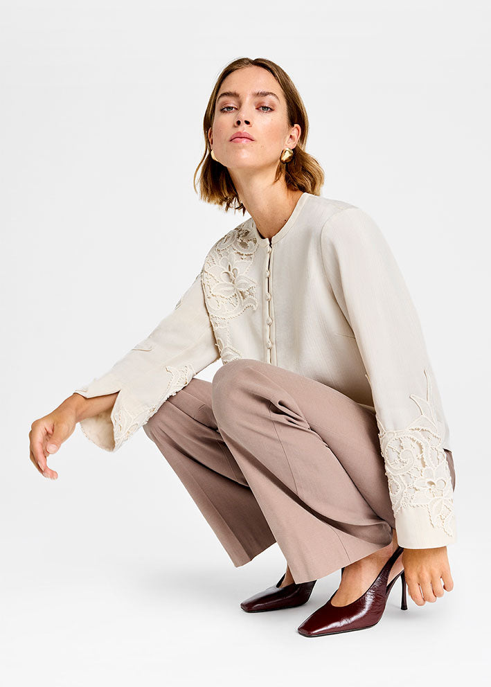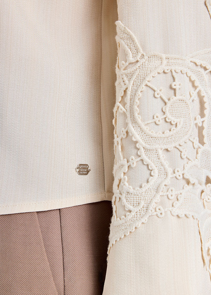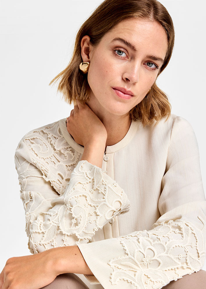 Umådelig smuk og elegant Cana bluse fra Gustav, designet i et enkelt stilrent snit med de fineste detaljer: Stolpelukning med betrukne knapper og unikke påsatte broderede blonder på bryst og ærmer.