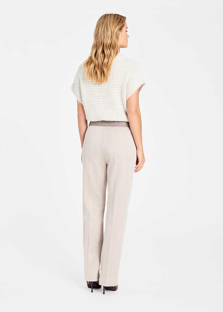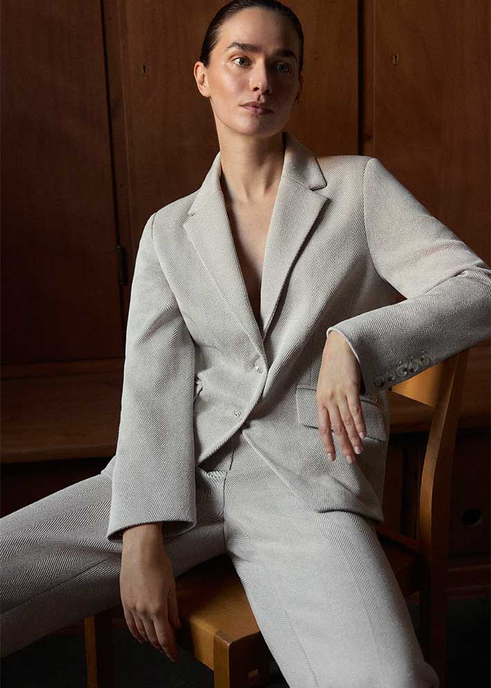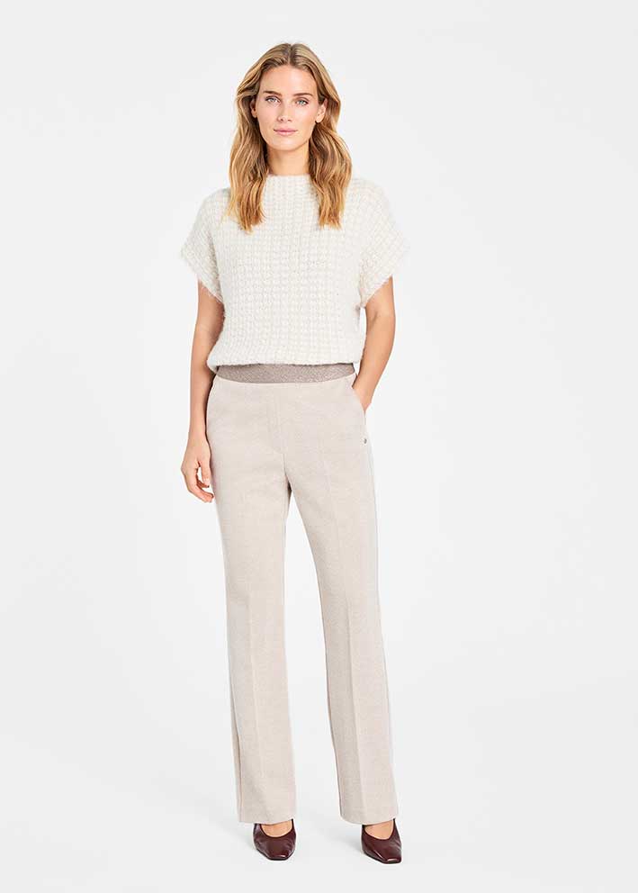 Sæsonens måske smukkeste sandfarvede sildebensvævede bukser: Marit bukserne fra Gustav, designet i en skøn stretchy jerseykvalitet, der gør at bukserne er super behagelige at have på og samtidig ser totalt stilfulde ud. Bukserne har desuden en dejlig bred elastiktalje og lange lige ben.