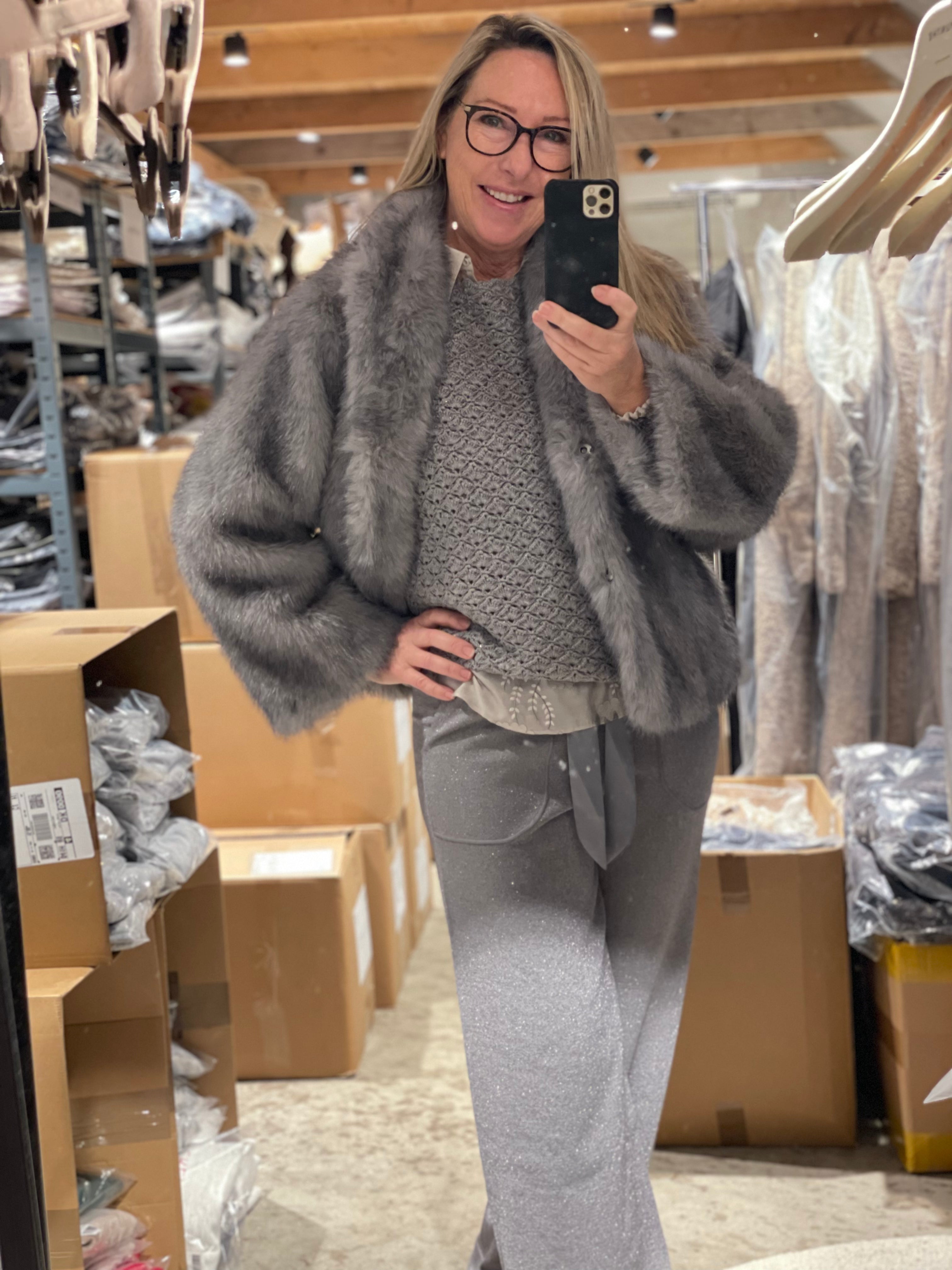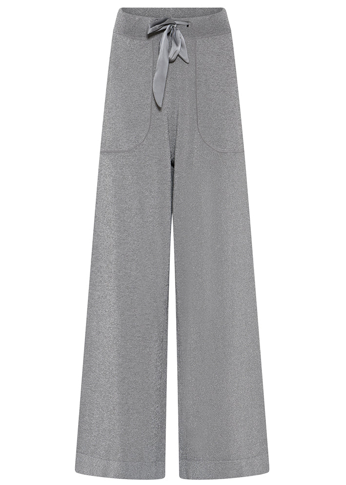 Elegante stålgrå Jessi strikbukser fra Gustav, designet med diskret glimmer. Bukserne har et helt enkelt snit med lange vide ben og bindebånd i taljen.