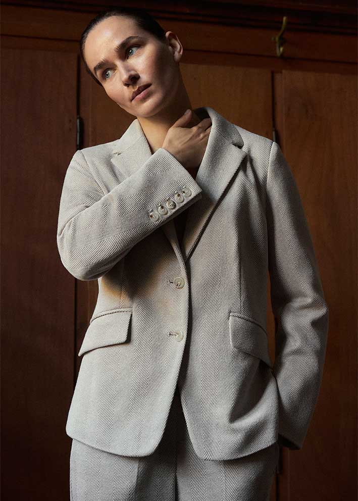 Smuk og elegant klassisk sandfarvet sildebensvævet Stacie blazer fra Gustav, designet i et stilrent snit med hakrevers, toknapslukning og lommer med klap samt slids og knapper ved ærmekanten.