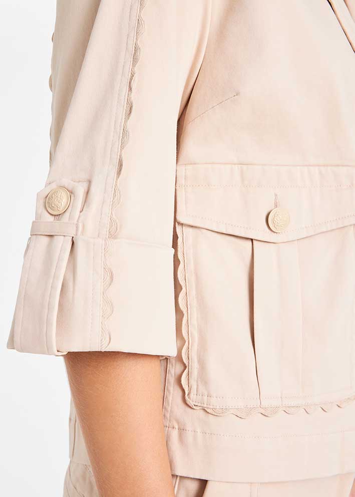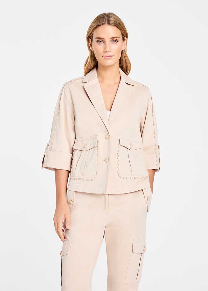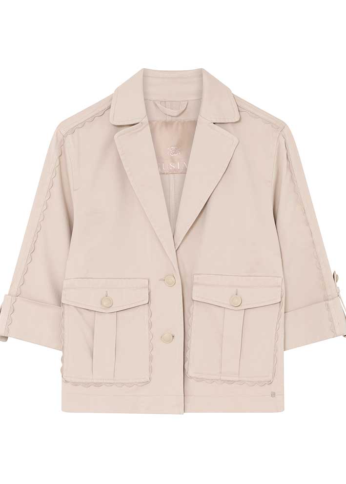 Denne korte trenchcoat er ideel til forår og efterår, hvor den giver lige præcis den rette mængde varme uden at være for varm. Den er lavet i en lækker bomuldskvalitet med et strejf af elastan, der sikrer god bevægelsesfrihed og en behagelig pasform.