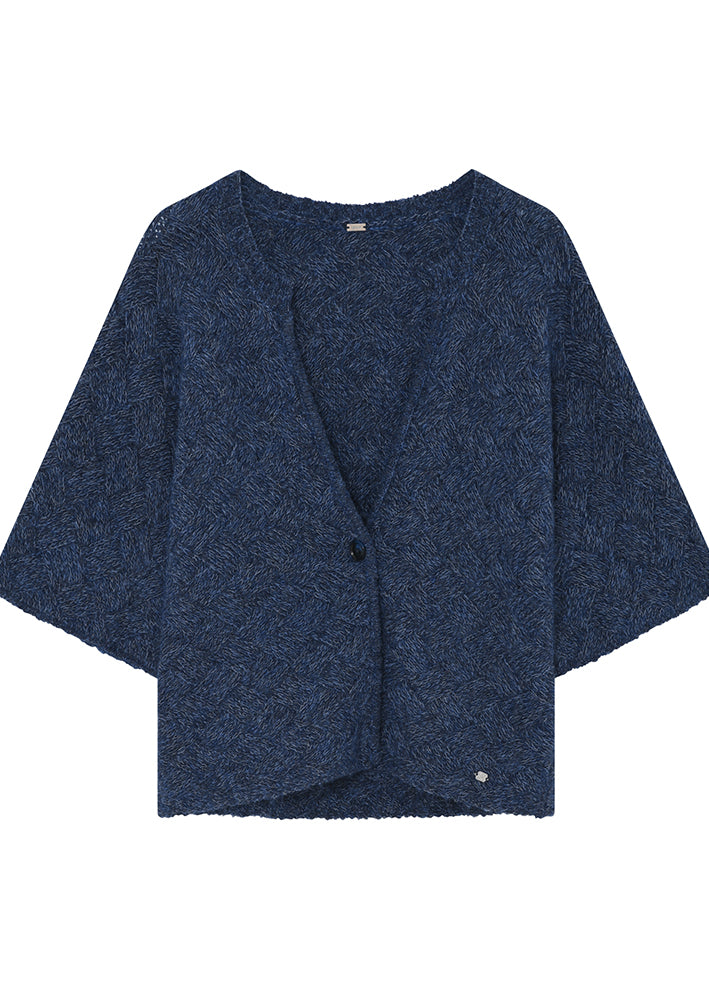 Smuk mørkeblå mønsterstrikket Anasia cape/cardigan fra Gustav, strikket i en lækker uldkvalitet. Strikken har et elegant snit med enknapslukning og halvlange vide ærmer.