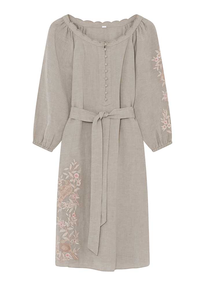 Dixi knælang kjole fra Gustav i en smuk artichoke-nuance kombinerer tidløs elegance med nordisk minimalisme, krydret med umådeligt smukke blomsterbroderier. Den lette blanding af 80% viskose og 20% hør giver kjolen en behagelig, åndbar kvalitet med et naturligt fald.