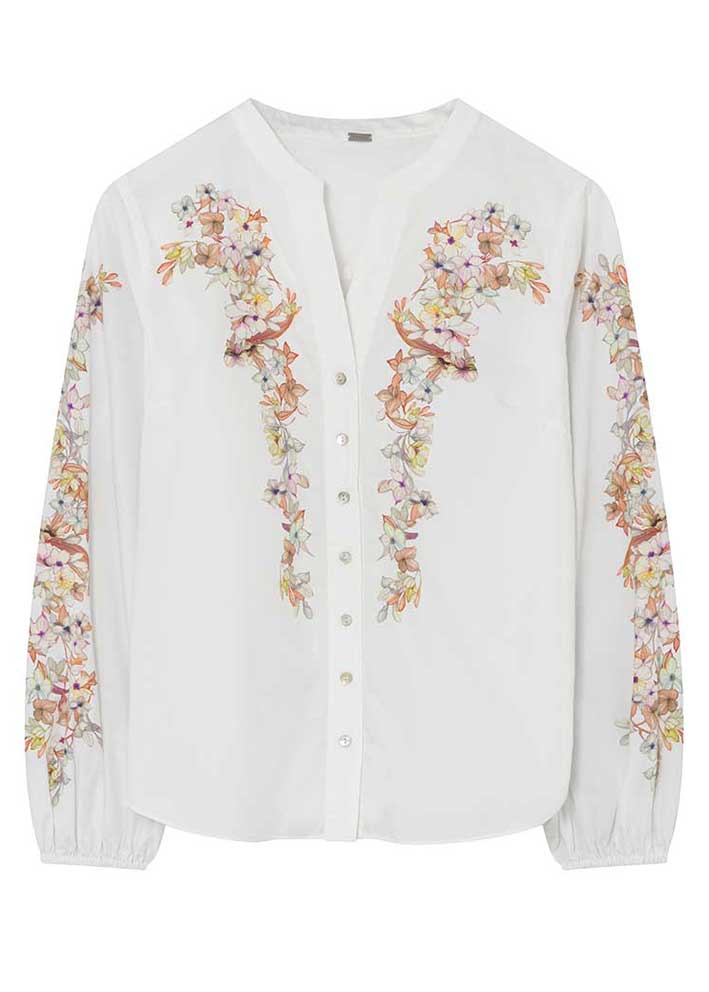 Smuk hvid Bayanna skjorte fra Gustav, designet med det skønneste blomsterprint i ranker over brystet og nedover ærmerner. Skjorten har et enkelt, klassisk snit med lille v-hals, knaplukning og lange ærmer.