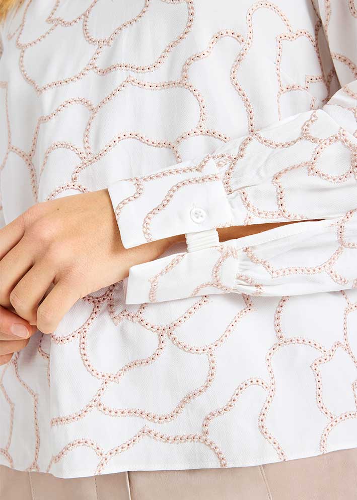 Smuk og elegant off-white Cana bluse fra Gustav, designet i 100% viscose, dekoreret med fantastiske blomsterbroderier i et mønster over hele blusen. Blusen har et løst snit, rund hals, nakkeslids med knap, stolpelukning og lange ærmer.