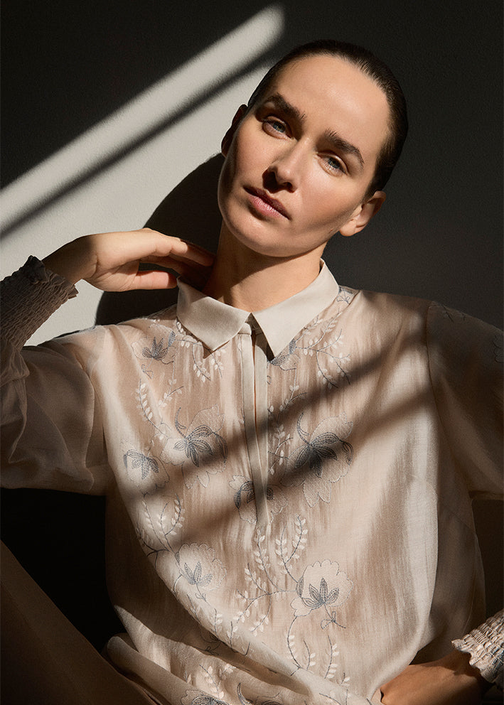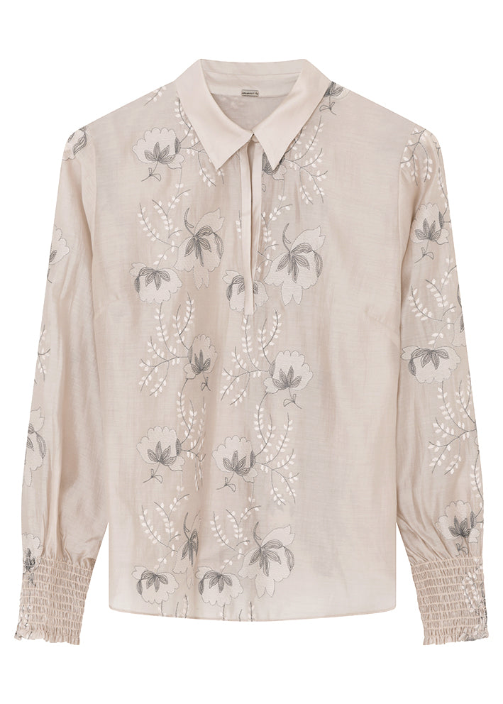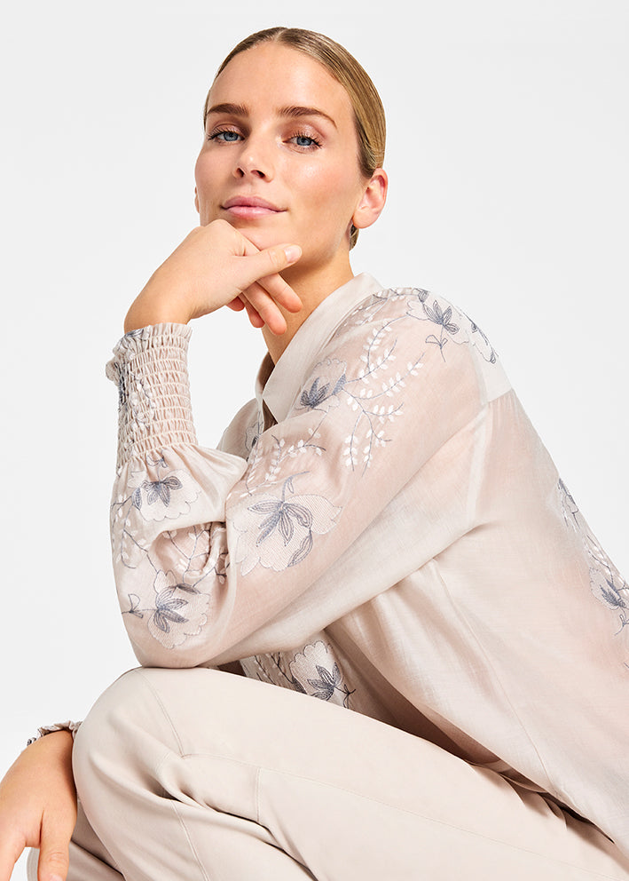 Umådelig smuk Bayanna bluse fra Gustav, designet med fantastisk flotte broderede blomster på både forstykke og ærmer. Blusen har et enkelt snit med lille krave, stolpelukning med knap og lange ærmer med smockmanchetter.
