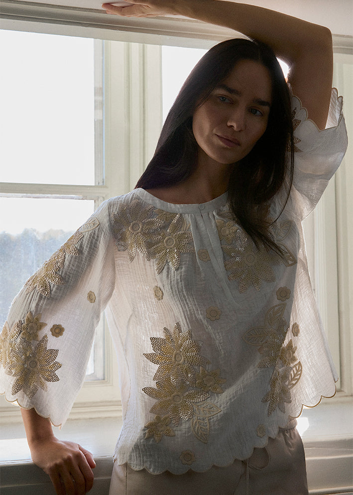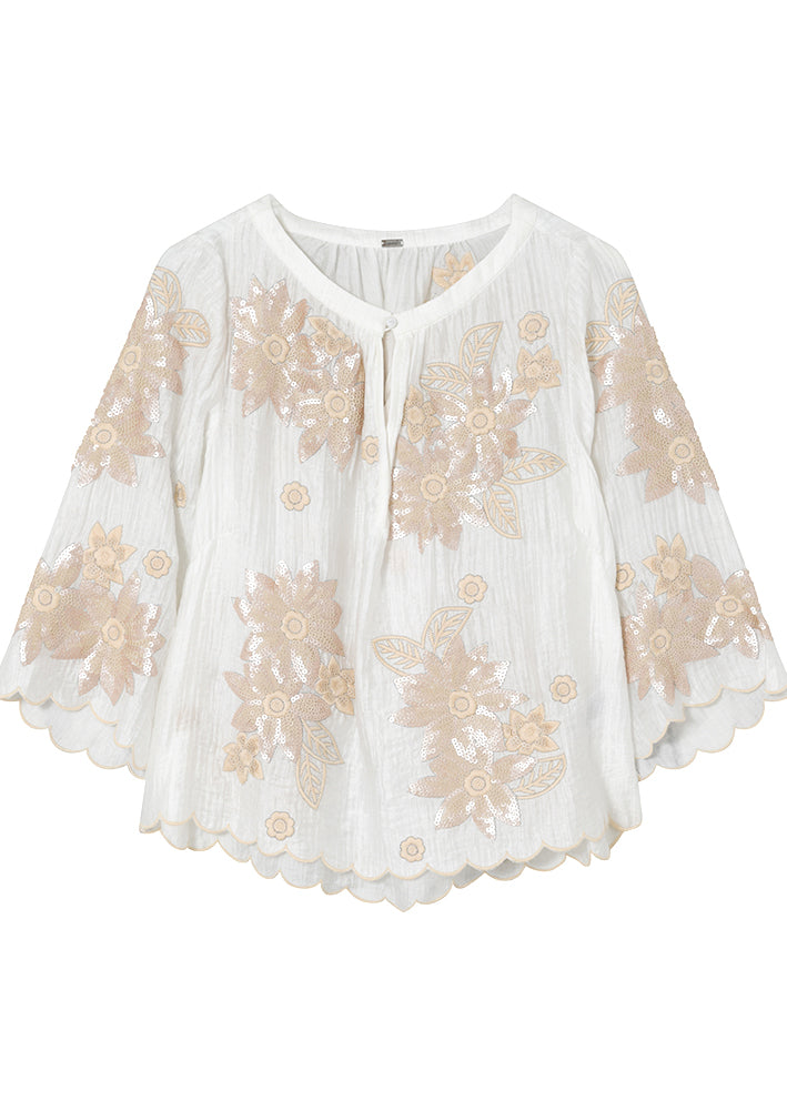Mira-blusen med umådeligt smukke perlebroderier fra Gustav er den perfekte kombination af elegance og komfort. Denne smukke bluse er skabt til den moderne kvinde, der værdsætter både stil og kvalitet "with a twist".