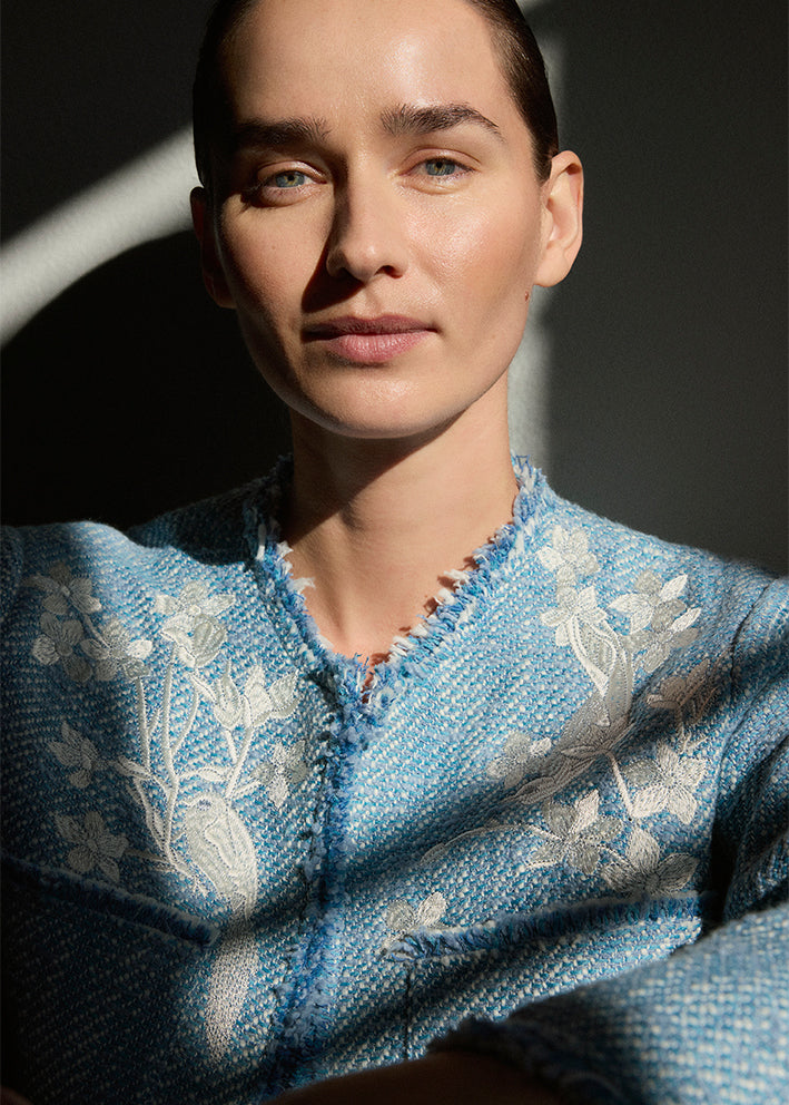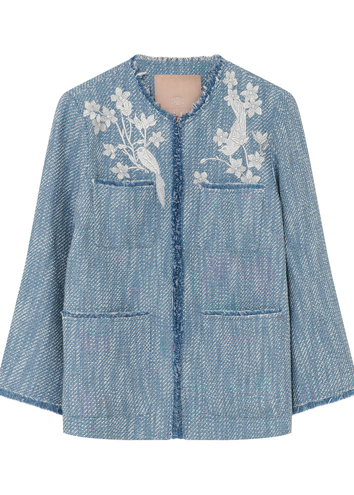 Umådelig smuk lyseblå-meleret grovvævet Philine jakke fra Gustav, designet i et boxy snit med rund hals, fire forlommer og vildt smukke broderier. Desuden har jakken de findeste frynsede kanter langs hals, lukning og ved ærmekanter.